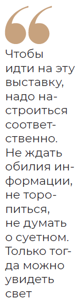 Чтобы идти на эту выставку, надо настроиться соответственно. Не ждать обилия информации, не торопиться, не думать о суетном. Только тогда можно увидеть свет.