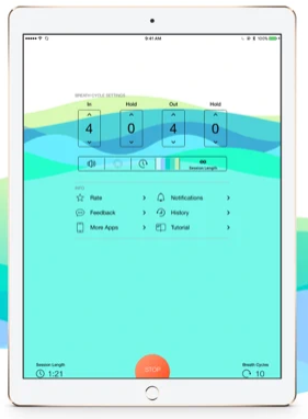 Приложение визуализирует процесс дыхания. В нём можно настроить циклы: вдох, задержка, вдох, задержка. Можно выбрать фоновый звук и длительность сеанса. За несколько минут дыхательных упражнений фокус внимания перемещается на дыхание, благодаря чему снижается тревожность. Breathe+ красиво анимирует ваше дыхание волнами. Если вы предпочитаете дышать с закрытыми глазами, можно настроить вибрацию. Она даст понять, когда заканчивать вдох и приступать к выдоху. Платная версия за 99 руб. в месяц отключает рекламу и разрешает менять цветовую тему приложения. Бесплатной версии вполне достаточно для пользования.