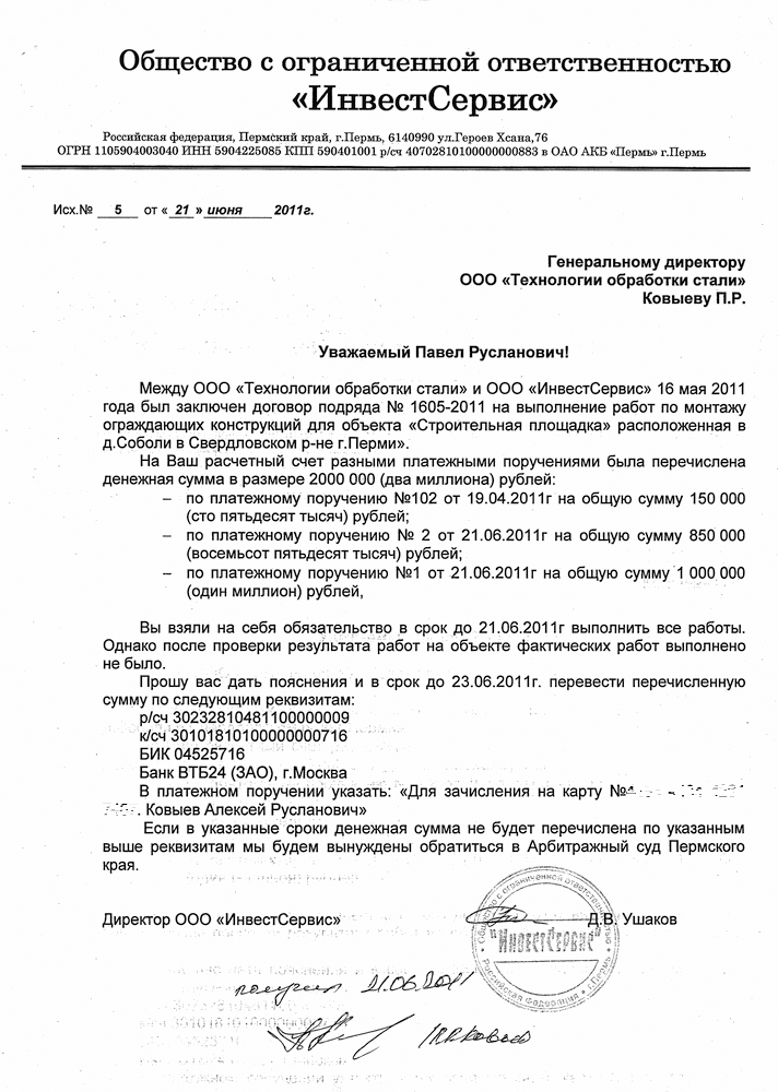 «На Ваш расчётный счёт разными платёжными поручениями была перечислена денежная сумма в размере 2 000 000 (два миллиона рублей)... Однако после проверки результата работ на объекте фактических работ выполнено не было. Прошу Вас дать пояснения и в срок до 23.06.2011 г. перевести перечисленную сумму по следующим реквизитам... В платёжном поручении указать: «Для зачисления на карту... Ковыев Алексей Русланович».
