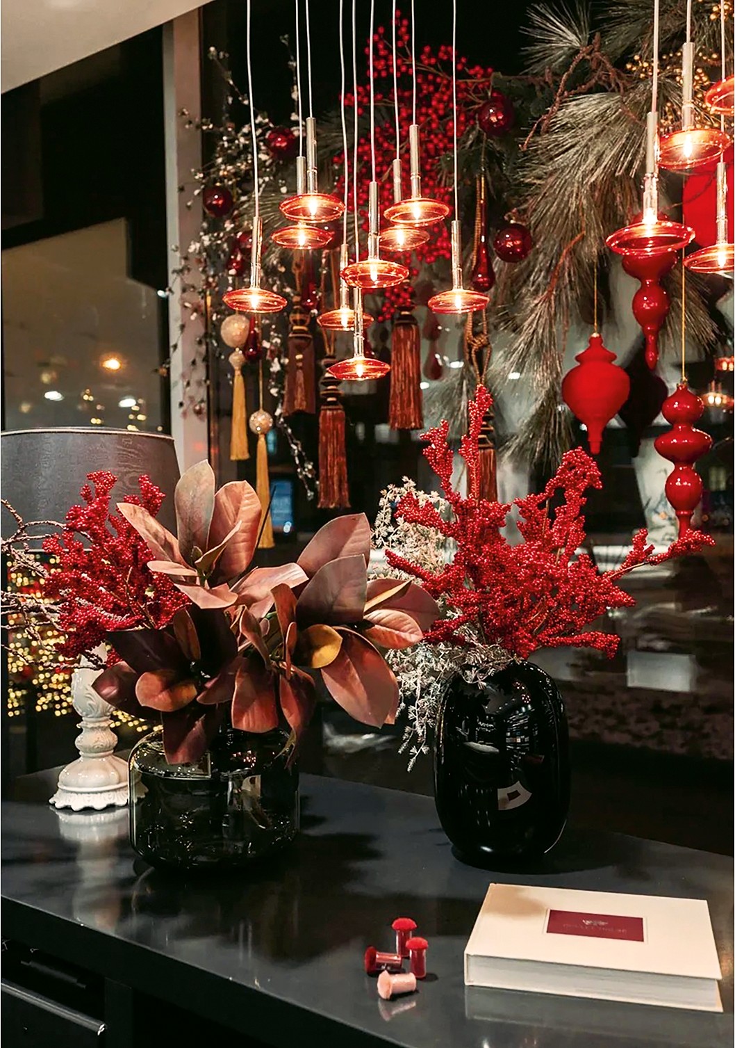 Любители ярких сочетаний могут добавить в композиции горшечную пуансеттию — красный цветок, который называют Рождественской звездой. Многим он знаком по американским фильмам — вспомните любой, действие которого разворачивается в рождественскую пору. Также добавить к хвое можно алые ягоды илекса, напоминающие калину. Илекс стойкий, после среза долго сохраняет свою красоту и хорошо гармонирует с другими цветами.