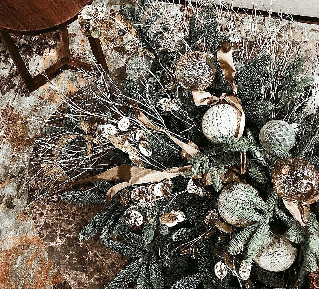 Предновогодняя пора — самый сезон хвойного декора. Поэтому я всегда предлагаю декорировать дом с помощью хвои. Помимо рождественской атмосферы она наполняет пространство приятным ароматом леса. Традиционно в композициях используют нобилис, тую, можжевельник и кедр. Сосновые и еловые ветви обладают меньшей стойкостью, но тоже могут стать частью декора. Композиции из нобилиса могут простоять и до следующего года, а вот туя, например, при высыхании начинает крошиться. Так или иначе, живые растения будут благодарны вам за правильный уход. Не забывайте подрезать их и менять воду или увлажнять оазис, на котором собрана композиция. И поставьте рядом увлажнитель.