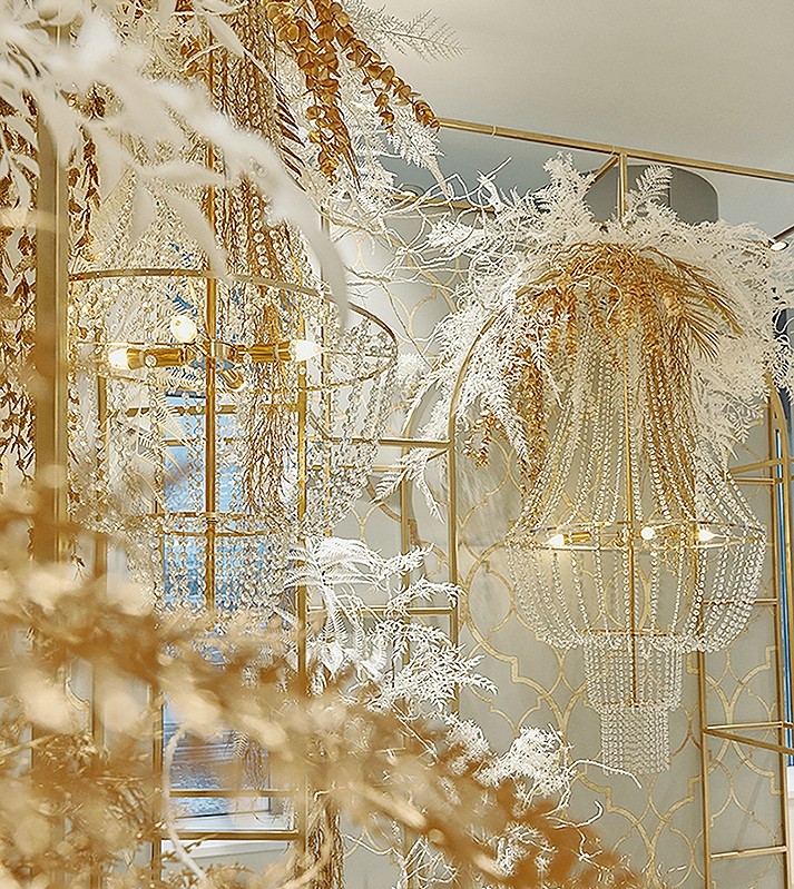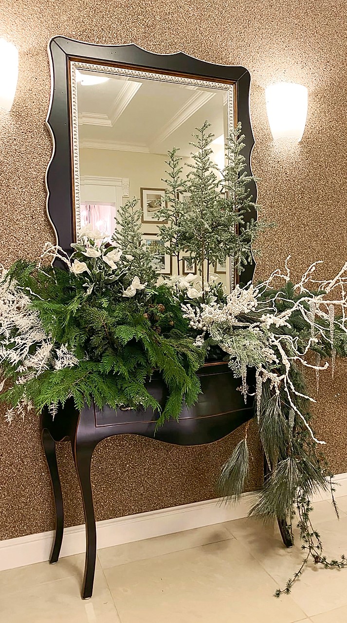 В свои композиции я люблю добавлять воздуха, группировать разные сорта растений и декоративных элементов, создавать асимметричные образы. Сейчас в магазинах можно найти декоративные ветви, припорошенные искусственным снегом, неприхотливый флоковый аспарагус. С ними можно делать облегчённые, воздушные композиции. Добавьте к этому, например, голые ветки из леса у дома, бусы и сосульки из стекла или качественного пластика.