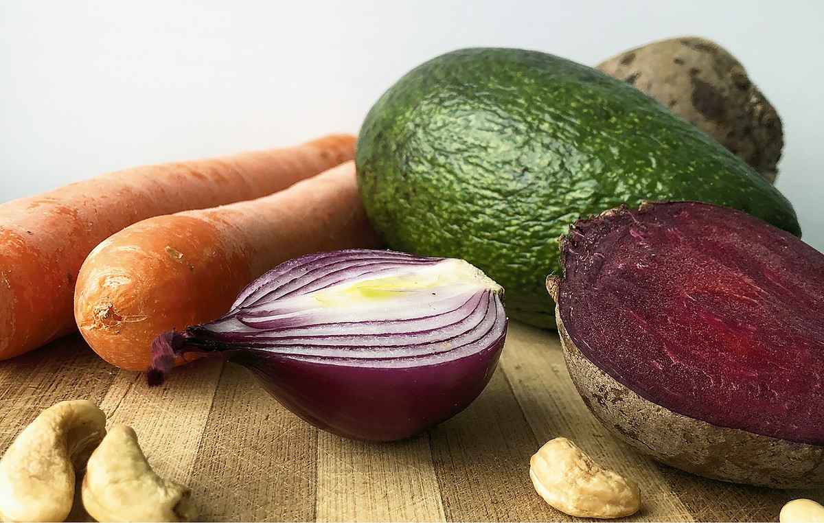 Свёклу и морковь сбрызгиваем оливковым маслом и заворачиваем в фольгу. Запекаем в духовке до мягкости. Остужаем, натираем на тёрке в разные миски. Авокадо нарезаем небольшим кубиком, лук — мелким аккуратным кубиком, сбрызгиваем винным уксусом и перемешиваем ингредиенты. Водоросли вакамэ заливаем кипятком, ждём, пока они распустятся, отжимаем и добавляем соевый соус и сок лайма.