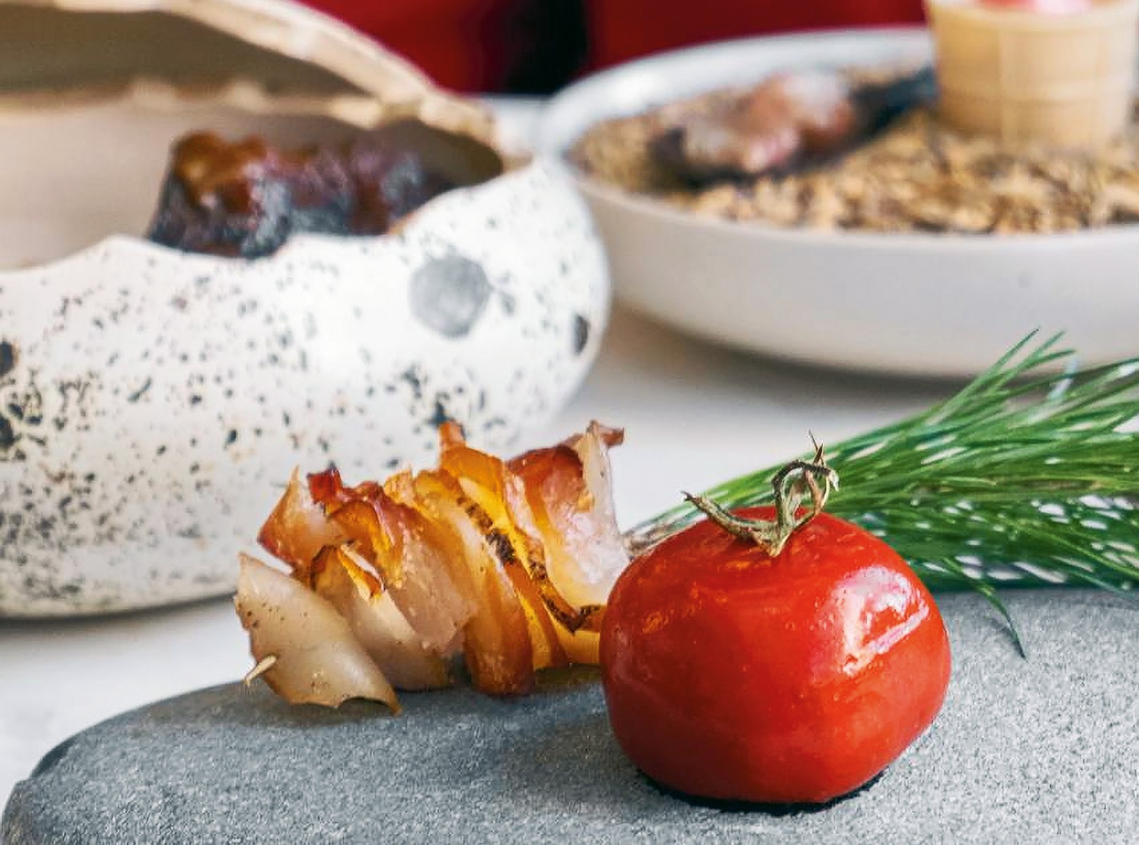 Паштет предлагаю делать в пакоджете, за счёт этого его структура станет более нежной. Заменить пакоджет можно блендером. Утиный паштет в моём сете выглядит как помидорка. Глазурь я делаю на основе малосольных томатов. Когда подаёшь блюдо, то видишь на лицах гостей удивление: зачем здесь помидор? Когда я разрезаю его деревянным ножом, удивление на их лицах сменяется шоком.
