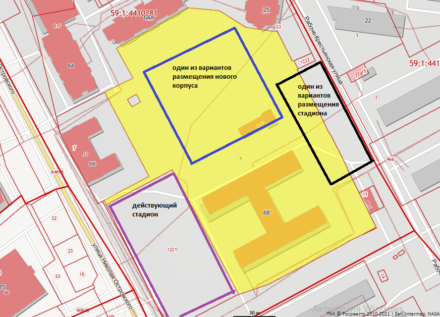 В 2022 году территорию гимназии №33 в Перми начнут активно застраивать: на земельном участке по адресу ул. Островского, 68 должен появиться новый корпус, а на месте действующего школьного стадиона по тому же адресу могут начать возводить частный спорткомплекс.
