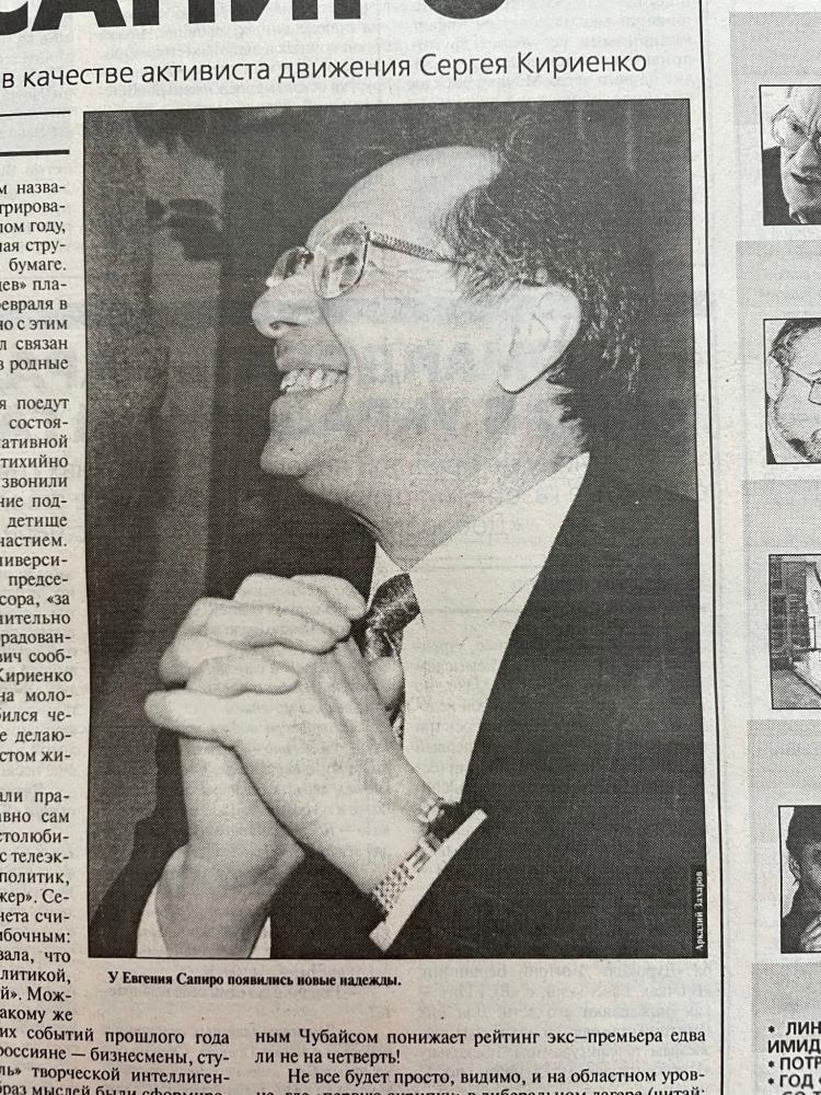 Весь год шла подготовка к выборам в Госдуму. В сентябре рейтинг популярности партий (движений, блоков) в Пермской области выглядел так: на первом месте — «Яблоко», на втором — блок «Отечество — Вся Россия», на третьем — КПРФ. Бывшим спикером ЗС Пермской области и бывшим министром по делам национальностей Евгением Сапиро в Прикамье была представлена партия «Новая сила» Сергея Кириенко, в которую вошли в том числе главный «кавээнщик» области Ямур Гильмутдинов и банкир Евгений Немоляев. В общем, этакий первый вариант «Новых людей», только не прошедший в Госдуму.