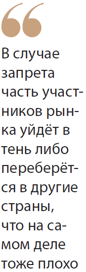 Ильдар Харипов, в свою очередь, доказывает, что запреты тормозят экономическое и технологическое развитие страны в целом, что любые вещи надо не запрещать, а регулировать. Большинство людей в криптоиндустрии, по его словам, как и в любой другой, не отрицают взаимоотношений с государством, не против платить налоги, декларировать, что у них есть, отчитываться, лицензироваться. «Люди у нас достаточно сознательные и законопослушные. Поэтому нужно не запрещать, а принять как неизбежное, что эта индустрия есть и она никуда не денется. В ближайшие 10 лет она будет в мире только развиваться. И здесь надо поставить цель — то, что невозможно запретить, надо возглавить и приступить к регулированию. Начать регулировать обмен, майнинг, все отрасли, которые так или иначе связаны с криптоиндустрией. По-умному, начиная с майнинга. Сначала максимальная свобода, а потом потихоньку усиление контроля», — делится своей точкой зрения на проблему эксперт.