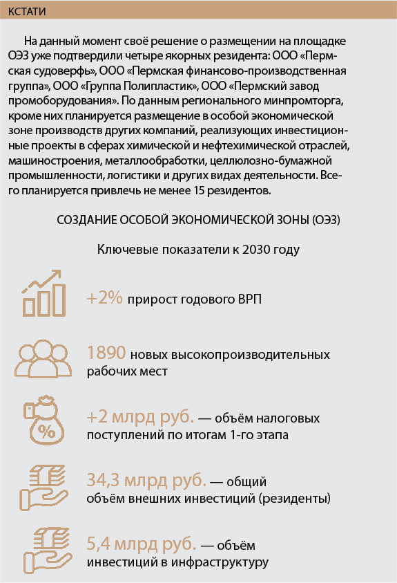 Как следует из документа, опубликованного на портале нормативных правовых актов, общий объём инвестиций потенциальных резидентов ОЭЗ «Пермь» в ближайшие 10 лет превысит 10 млрд руб. Также планируется, что до 2025 года из бюджета Пермского края будет направлено более 1 млрд руб. на создание инженерной, транспортной и социальной инфраструктуры в ОЭЗ.