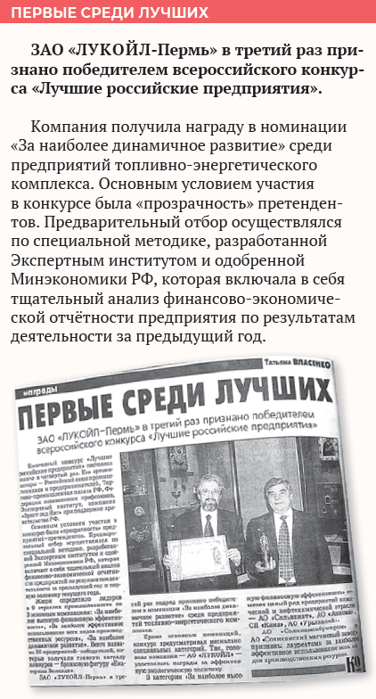 ЗАО «ЛУКОЙЛ-Пермь» подписало контракт с компанией PricewaterhouseCoopers. Предприятие поставило перед собой задачу выйти на мировой уровень. В ходе реализации проекта будут внедряться международные стандарты финансовой отчётности, обеспечиваться оперативность, точность и прозрачность управленческой информации.