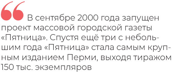 Спустя ровно три года после выхода первого номера «Нового компаньона», в сентябре 2000 года, издательский дом «Компаньон» запустил проект массовой городской газеты «Пятница». Спустя ещё три с небольшим года «Пятница» стала самым крупным изданием Перми, выходя тиражом 150 тыс. экземпляров.