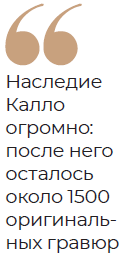 — Своей изящной иглой Калло отправил жить на крохотные листочки бумаги десятки и сотни персонажей: бретёры и мушкетёры, ландскнехты и крестьяне, актёры комедии дель арте и пауперы разных мастей. В его графических миниатюрах намертво слиты макромир и микроформа, здесь всё равно всему: сакральное и светское, ярмарки и война, казни и турниры. Оптика Калло — плод трезвого наблюдения и размышления стороннего свидетеля, не обольщающегося действительностью, но и не сочувствующего ей, а лишь стремящегося к её познанию. «Не плакать, не радоваться, но понимать» — этот завет Спинозы как бы является символом веры и для искусства Калло.