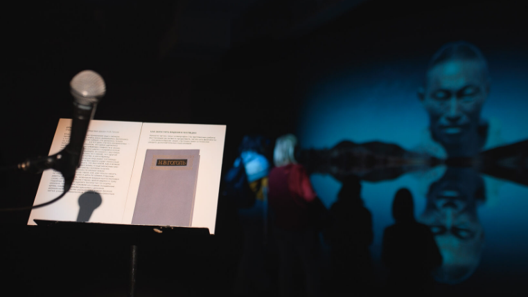 Всё работает очень просто. В полутёмном зале — большой экран, микрофон на стойке и две книги на пюпитрах. Первая — это, собственно, «Мёртвые души»: чтобы запустить демонстрацию на экране, посетитель должен прочитать в микрофон начало гоголевской поэмы. Вторая книга — фотоальбом… Но о нём чуть позже.