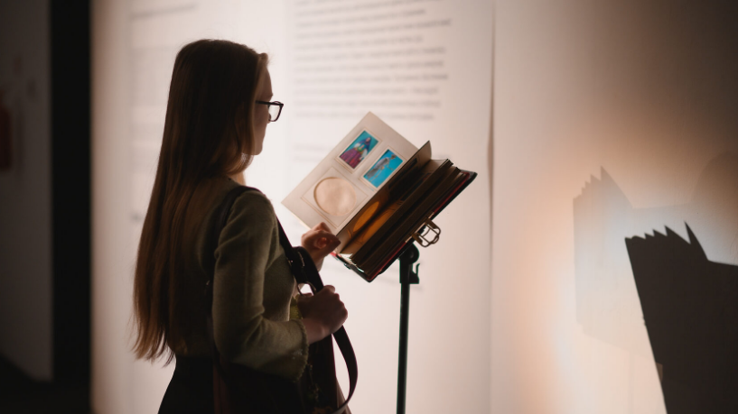 Инсталляция демонстрируется всего шесть минут, а на выходе из зала посетителя встречает вторая книга на пюпитре — старинный фотоальбом в бархатном переплёте, на страницах которого художница разместила фотоколлажи, сделанные по мотивам «путешествия».