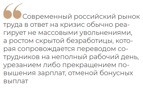 Есть вероятность, что безработица может увеличиться сверх пиковых значений пандемийного периода, но при этом не достигнет критического уровня, как это было в 90-х годах, предполагает Елена Попова. Современный российский рынок труда в ответ на кризис обычно реагирует не массовыми увольнениями, а ростом скрытой безработицы, которая сопровождается переводом сотрудников на неполный рабочий день, урезанием либо прекращением повышения зарплат, отменой бонусных выплат. Работодатели в целом, как и в период коронакризиса, будут стараться сокращать не занятость, а зарплатный фонд, считает она.