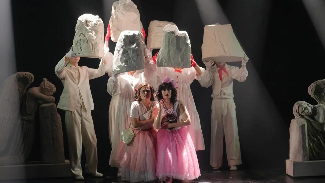Смерть в этом спектакле предстаёт в разных обличьях: милые ангелочки в белом — та самая массовка — мельтешат вокруг героинь, перевоплощаясь то в зрителей театра, то в официантов в кафе; надгробия разных форм — обелиски, статуи, «голгофы» — составляют все пейзажи и интерьеры, в которых оказываются Аннетта и Бернадетта (сценограф и художник по костюмам — Надежда Осипова); то и дело дамочек заливает холодный свет откуда-то сверху, словно напоминая: «memento mori» (художник по свету — Евгений Козин). Это всё не делает спектакль мрачным — он озорной и яркий. Макабр — ироничное, на грани кощунства высказывание о смерти — вовсе не выдумка постановщика, а верность тексту пьесы, где героини рассуждают, например, о том, как неприятно было бы съесть рыбу, которая съела червяка, который съел их мамочку.