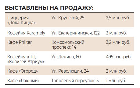 Среди заведений, выставленных на продажу за последнее время, — пиццерия «Дока пицца» на ул. Крупской, 25, кофейня Karamely на ул. Екатерининской, 122, кафе Philter на Комсомольском проспекте, 14, кофейня в ТЦ «Колизей Атриум», кафе «Огород» на ул. Революции, 24 и «Лакшми» в Тополевом переулке, 5.