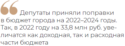 Помимо этого, депутаты приняли поправки в бюджет города на 2022—2024 годы. Так, в 2022 году на 33,8 млн руб. увеличатся как доходная, так и расходная части бюджета. При этом сократятся расходы в связи с экономией от размещения муниципального заказа в сумме 6 млн руб.