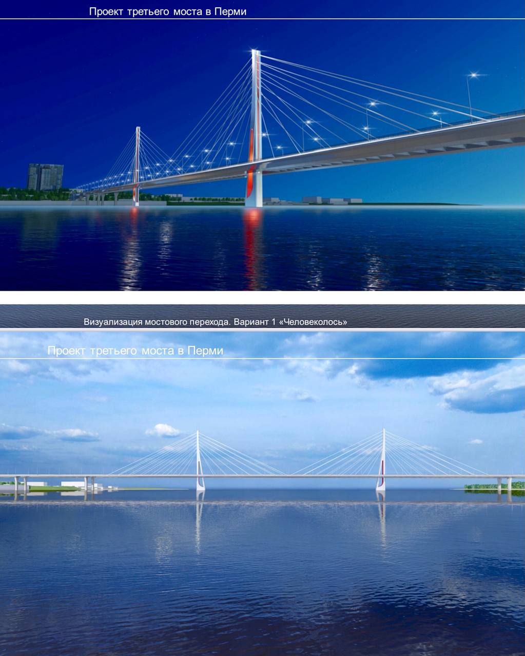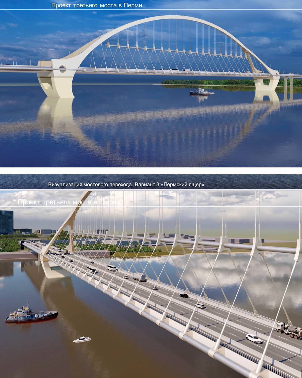 На краевом градсовете представили визуальные решения третьего моста через Каму. Проектировщики показали три варианта из разработанных восьми (представленные варианты были предварительно отобраны). При этом все варианты разработаны для одного места размещения нового моста — в створе площади Гайдара с выходом на улицу Окулова (с местом уже определились окончательно). По контракту завершить проектирование и представить проектно-сметную документацию подрядчик ООО «Гео-проект» должен в августе 2023 года. Строительство могут начать в 2024 году. По предварительным оценкам, возведение нового моста обойдётся в 43 млрд руб.