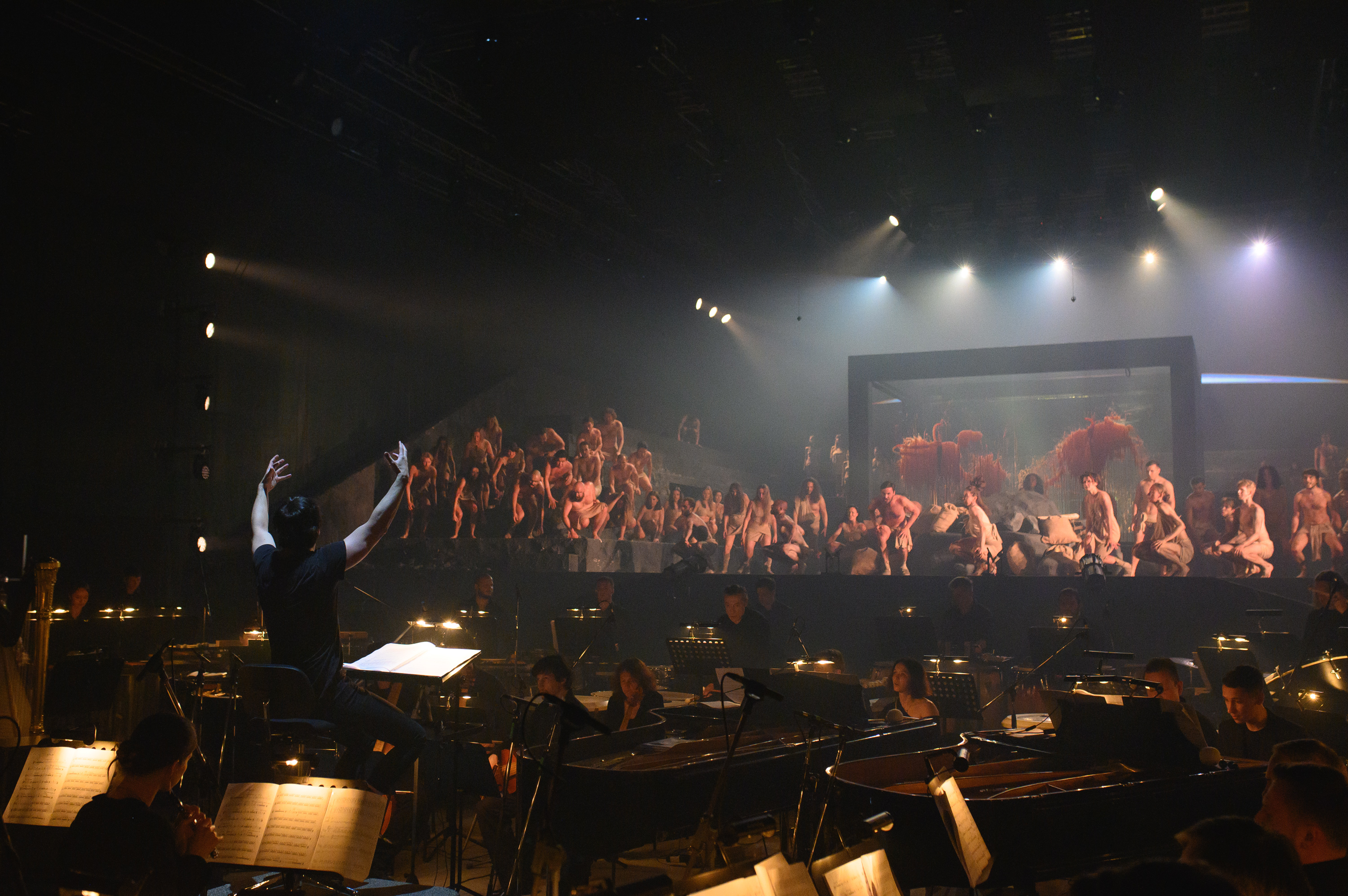 Если бы De temporum fine comoedia («Мистерия на конец времён») исполнялась в концертном варианте, это уже было бы зрелище. Оркестр был так выразителен визуально, что постоянно отвлекал внимание от сцены: достаточно сказать, что за каждым из трёх роялей было два музыканта, один из которых играл на препарированных струнах. Из этого концерта можно было бы сделать классное шоу… Но цель события была не в этом.