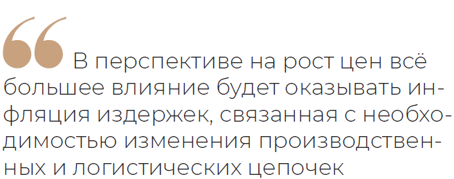 По мнению Татьяны Букиной, в перспективе на рост цен всё большее влияние будет оказывать инфляция издержек, связанная с необходимостью изменения производственных и логистических цепочек, вызванные влиянием внешнеполитических факторов. «Санкции и контрсанкции заставляют предпринимателей перестраивать бизнес-процессы, — отмечает Татьяна Букина. — А это ведёт к существенным издержкам».