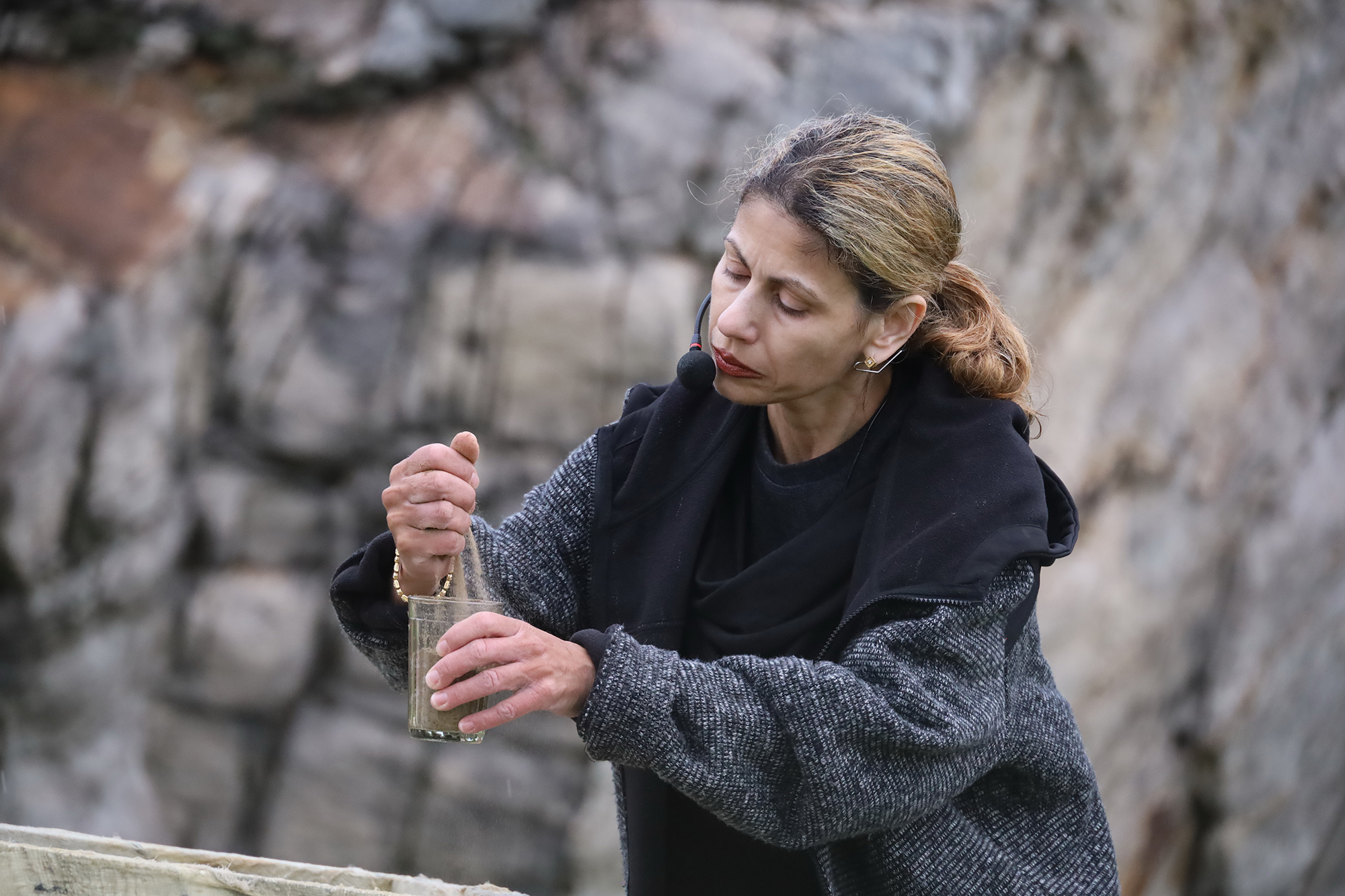 «Песнь Аджимушкая» играли среди останцов Рудянского споя, и это было единственное представление на фестивале, которому не повезло с погодой: шёл проливной и очень холодный дождь. Хотя… Может быть, как раз повезло: в спектакле речь идёт о людях в экстремальных условиях, и реальность решила усилить этот момент специальными природными эффектами.