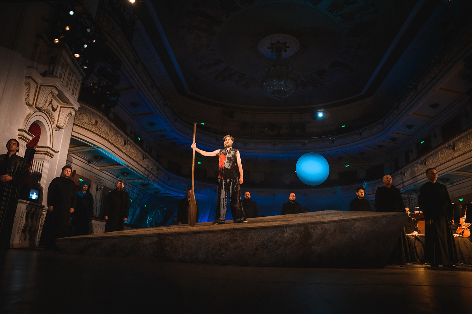 Не в первый раз сцена и зрительный зал меняются в пермской опере местами, и всегда этот перевёртыш обозначает взгляд в иной мир — и в «Орфее» (16+) Монтеверди в постановке Георгия Исаакяна, и в Cantos (12+) Алексея Сюмака в постановке Семёна Александровского и Теодора Курентзиса. Во всех этих случаях — а также в «Сне в летнюю ночь» (12+) в Театре-Театре в постановке Бориса Цейтлина — зал со сцены выглядит как загадочная бездна. В Cantos это впечатление усиливается таинственными огнями и настоящим лесом голых деревьев, и в «Реке Кёрлью» этот приём повторяется: зал превращается в очень большую, глубокую и объёмную декорацию — сумеречный пейзаж с деревьями, огромной луной и развевающимися под ветром парусами лодки (художник-постановщик Екатерина Барышникова). Сами собой возникают в голове дантовские строки про сумрачный лес; они тут очень к месту, ведь «Река Кёрлью» — это не житейская история, а притча, путешествие здесь метафорическое, паломники и Сумасшедшая отправляются не просто к могиле ребёнка, а на встречу с иным миром, к новому знанию и просветлению, к концу всех времён.