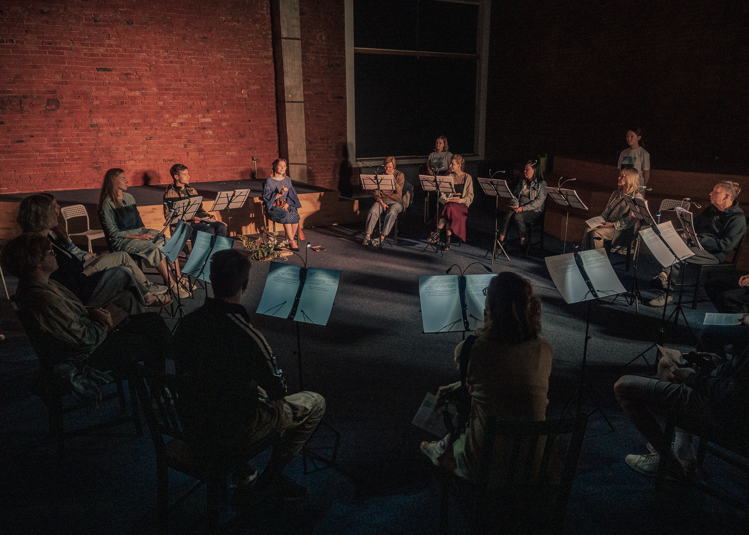 Это касается и самой большой и сложной работы в рамках проекта — «Улетают птицы», оперы, написанной композитором Легионы Целебровски и либреттисткой Дариной Чирковой на тексты воспоминаний Раисы Степановны — пожилой жительницы коми-пермяцкой деревни. «Улетают птицы», конечно, очень специфическая «опера», в качестве оркестра тут — восемь аудиоплееров, которые сосредоточенные перформеры включают и выключают по сигналу «дирижёра», единственный живой голос — солистка, всё та же Даша Калина, которая, как васнецовская Алёнушка, сидит на бережку пруда, в воде которого — не прикамские кувшинки, а тропические лотосы, поскольку дело происходит в оранжерее ботанического сада Пермского университета (ПГНИУ). Эту локацию Александр Шумилин счёл наиболее подходящей для передачи атмосферы «лесного края».