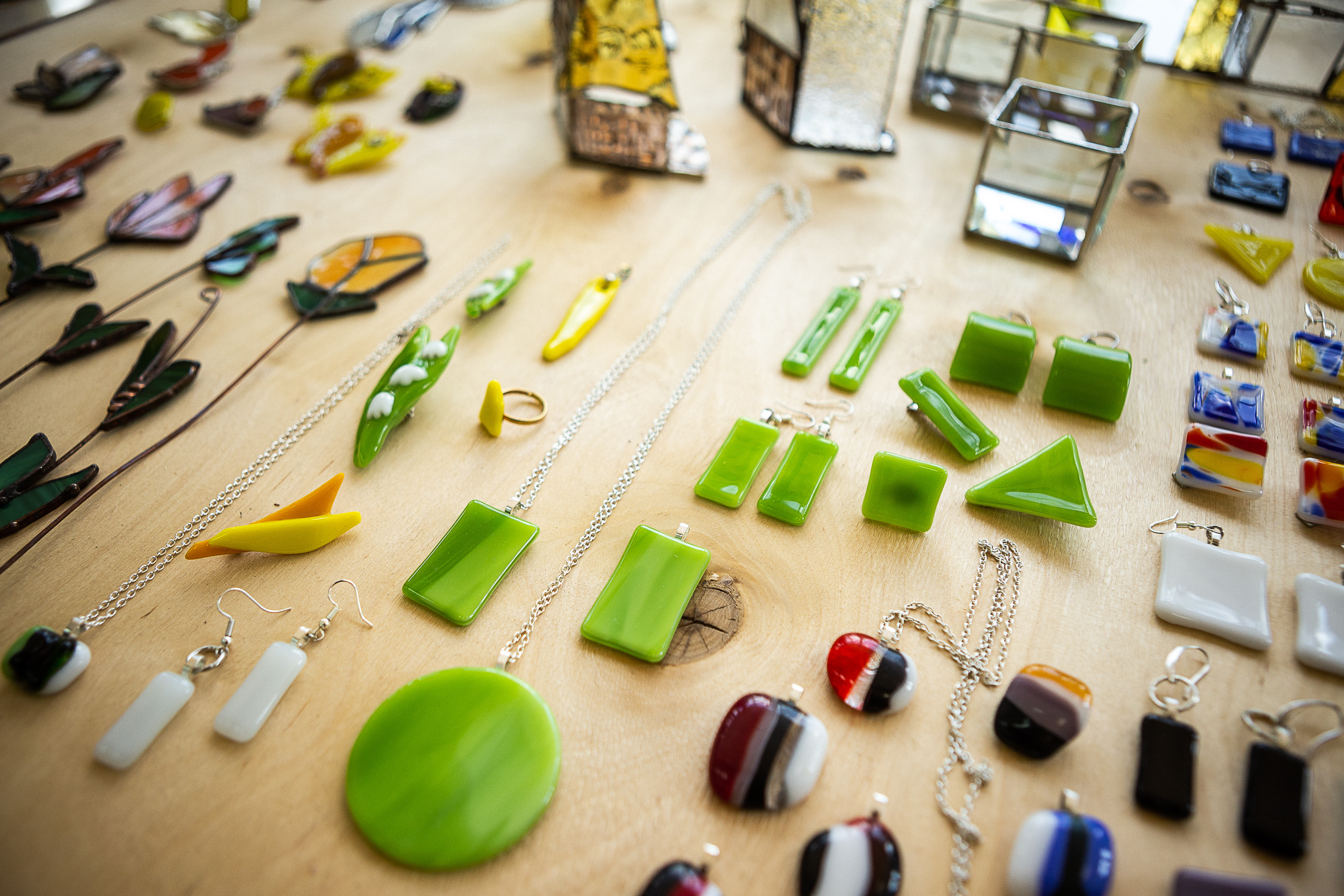 Алла Шикалова в Чайковском — художник с именем. Она работает в технике витража, создаёт авторскую бижутерию, а на выставке представила трогательные инсталляции с природными объектами — «Слёзы берёзы», где на кусочке бересты виднеется маленькая красная стеклянная капля, и «Эхо» — ракушка, обрамлённая каплями олова.