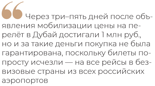 Однако главная причина выгоды отложенного туризма сегодня — это рекордный рост цен на авиабилеты как последствие объявления частичной мобилизации в России. Юлия Пьянкова сообщает, что через три—пять дней после объявления мобилизации цены на перелёт в Дубай достигали 1 млн руб., но и за такие деньги покупка не была гарантирована, поскольку билеты попросту исчезли — на все рейсы в безвизовые страны из всех российских аэропортов.