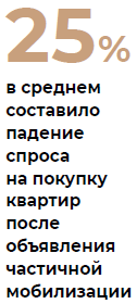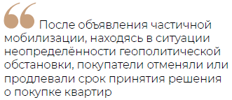 По данным PAN City Group, после объявления частичной мобилизации, находясь в ситуации неопределённости геополитической обстановки, покупатели отменяли или продлевали срок принятия решения о покупке. В среднем отмечено падение спроса на 25%.