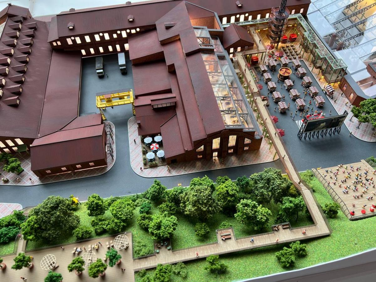 В макете масштабом 1:200 всё точно соответствует проекту, кроме крыш зданий — они сделаны прозрачными, чтобы можно было увидеть не только территорию, но и внутреннее пространство самого большого архитектурного комплекса «Станции культуры»