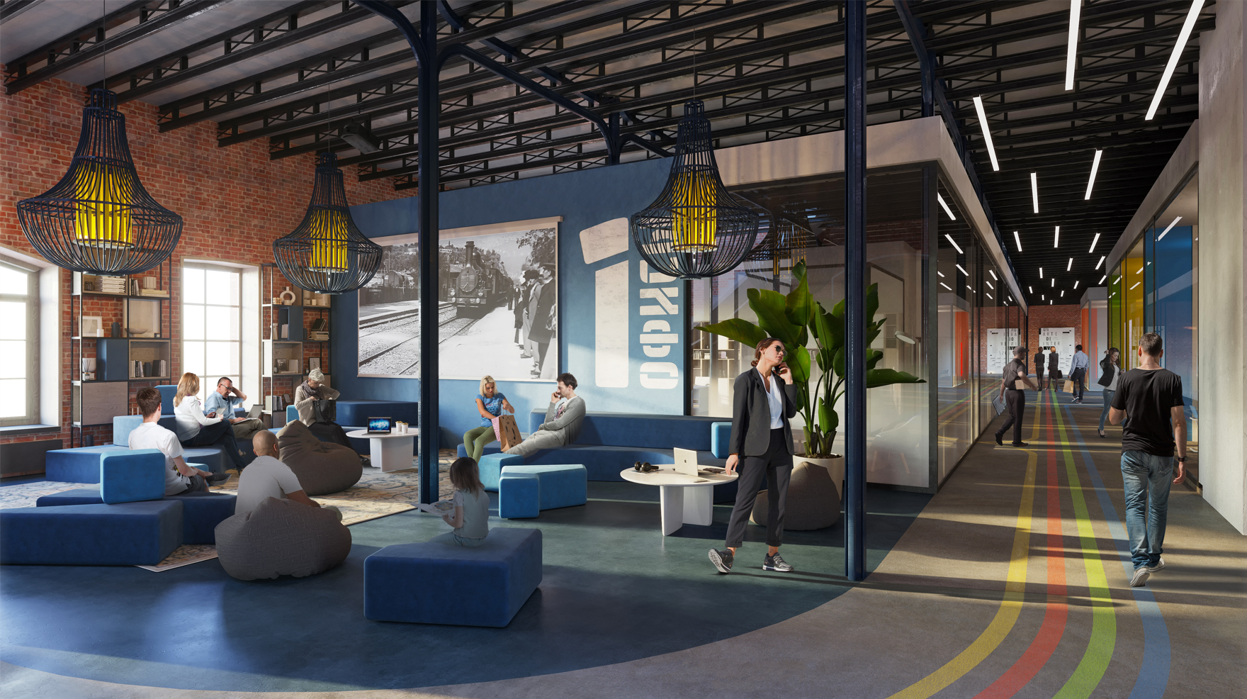 Все помещения будут соединены между собой, в любое можно будет проникнуть из соседних благодаря длинной галерее вдоль железной дороги. Здесь будут сдаваться в аренду помещения под офисы, которые расположатся в два этажа, кроме того, будут организованы переговорные комнаты, небольшие конференц-залы, коворкинги и другие помещения для бизнеса.