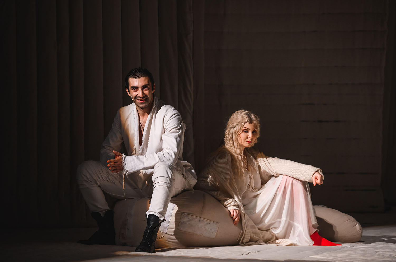 От большой многословной повести осталось несколько десятков реплик, герои лишились бэкграунда, сюжет сведён к нескольким узловым моментам. Персонажи условны, приравнены к типажам, черты их характеров и внешности укрупнены до гротеска. Вот Борис Тимофеевич Измайлов, свёкор Катерины (Альберт Макаров), волею художника по костюмам Ольги Шаишмелашвили превращённый в Ивана Грозного с портрета Васнецова (или из фильма Эйзенштейна); вот Сергей (Марат Мударисов) — этакий похотливый кавказец, щеголяющий голым торсом, покрытым шерстью и мускульными «кубиками», вот муж героини — Зиновий Борисович, до того нелепый, что начинаешь ему искренне сочувствовать: Иван Вильхов играет жертву врождённых, как теперь принято говорить, «особенностей», а к таким людям в наши дни отношение иное, нежели во времена Лескова. Сонетка (Алиса Санарова), которой досталось совсем мало текста и действия, — порочный эльф, обманчиво хрупкое хищное существо.