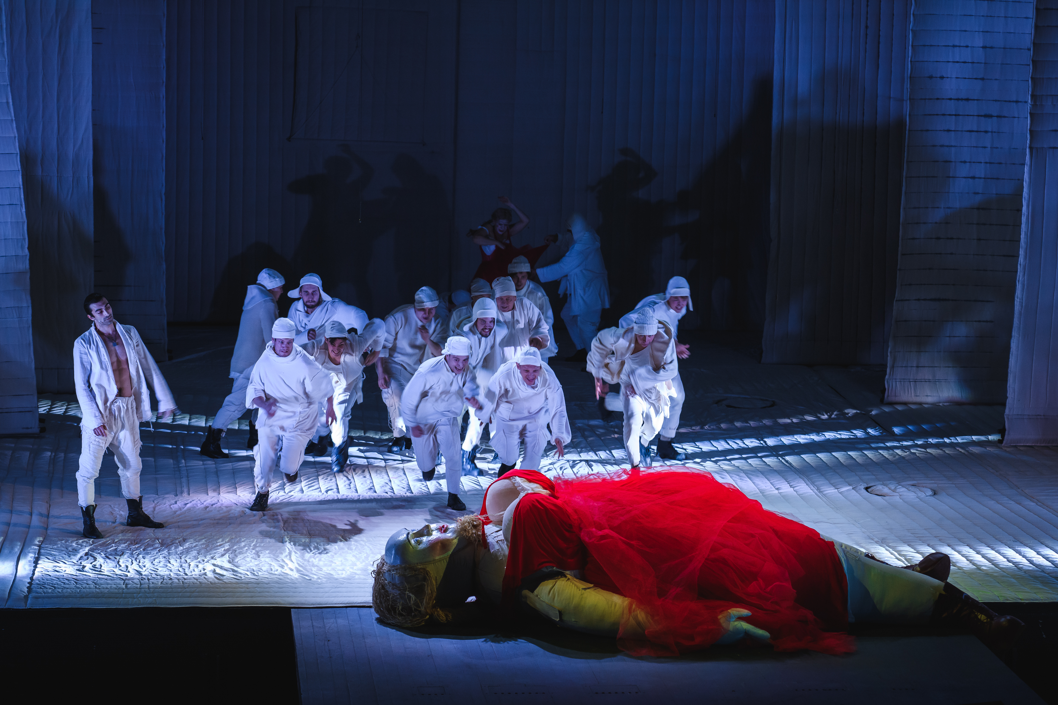 Примечательно, что актёры демонстрируют не только умение играть гротеск, но и готовность принять эту стилистику и жить в координатах, скорее, балетного либретто, чем драматического спектакля. Это действительно отчасти балет: все самые эмоциональные эпизоды решены в пластике и подчинены движенческой партитуре, а сцена надругательства над Аксиньей — отдельный танцевальный номер (хореограф — Александр Андрияшкин).
