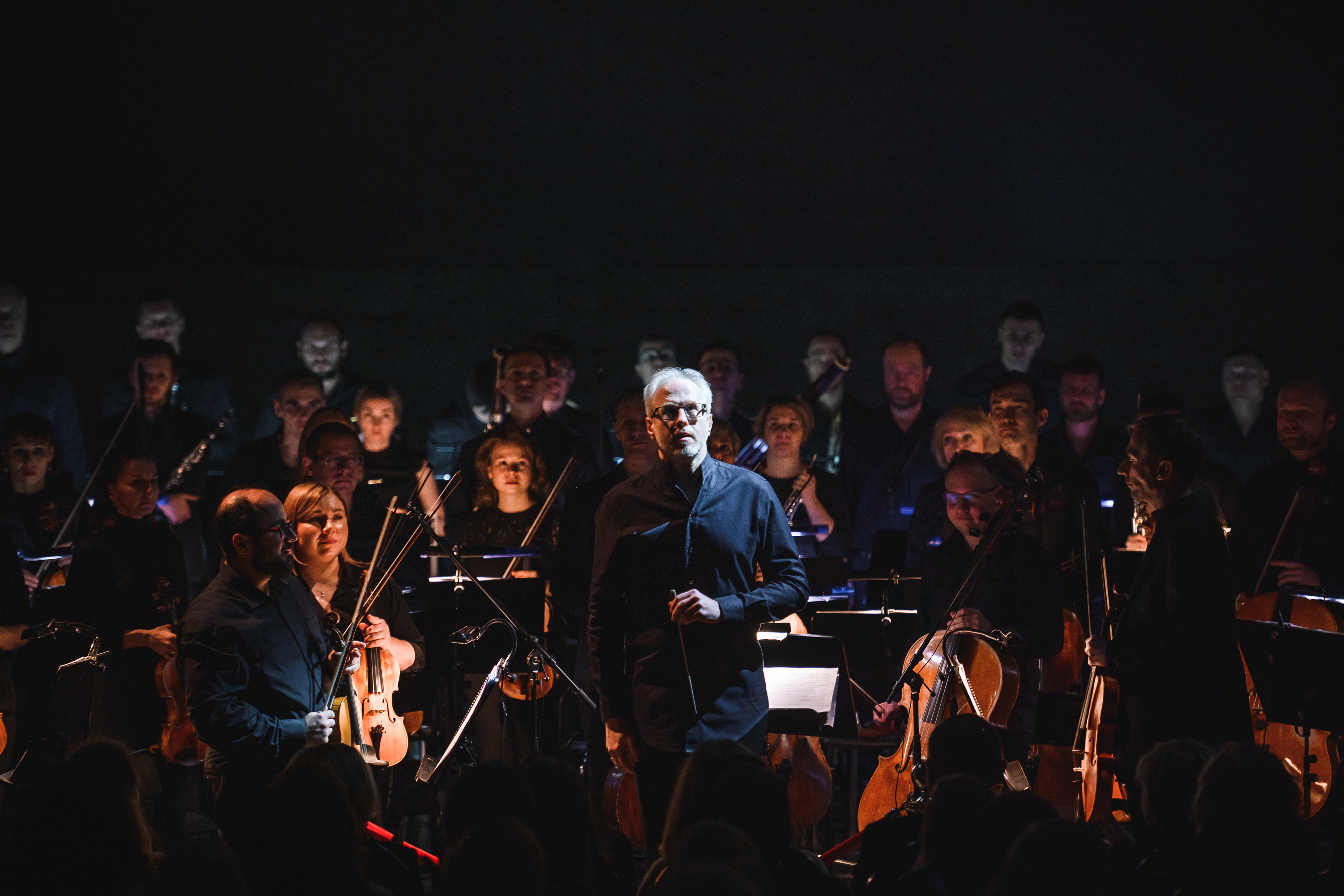 Оперные традиции решительно отметаются. Пространство организовано примерно так же, как на постановке «De temporum fine comoedia» (18+) Карла Орфа на Дягилевском фестивале: огромный оркестр — прямо в зале, где убраны первые ряды кресел; действие происходит в небольшом пространстве, высоко поднятом над уровнем сцены. Всё объединено, всё вместе — оркестр, певцы, видео, — и это важно, ведь опера Бартока не делится на сцены и арии, она вся — сплошной, непрерывный диалог между герцогом и Юдит, и столь же непрерывна и едина музыкальная ткань, в которой нет ни одного разрыва, ни одного шва; благодаря объединению всех медиа зритель буквально погружается в этот поток с головой и на протяжении всего спектакля не может ни всплыть, ни вздохнуть.