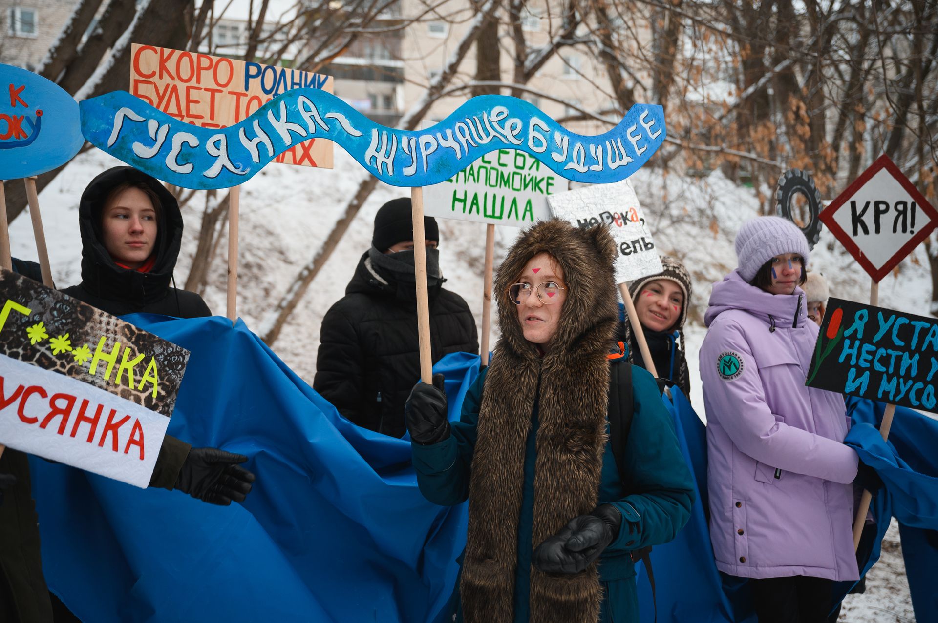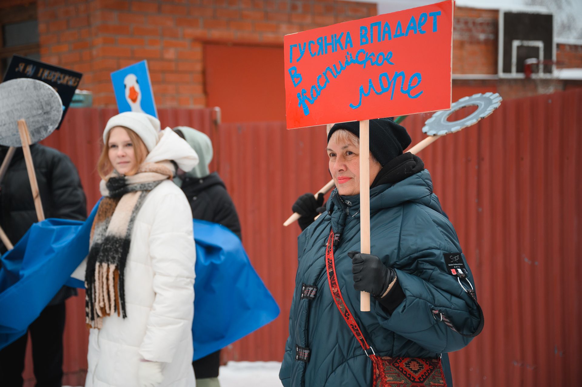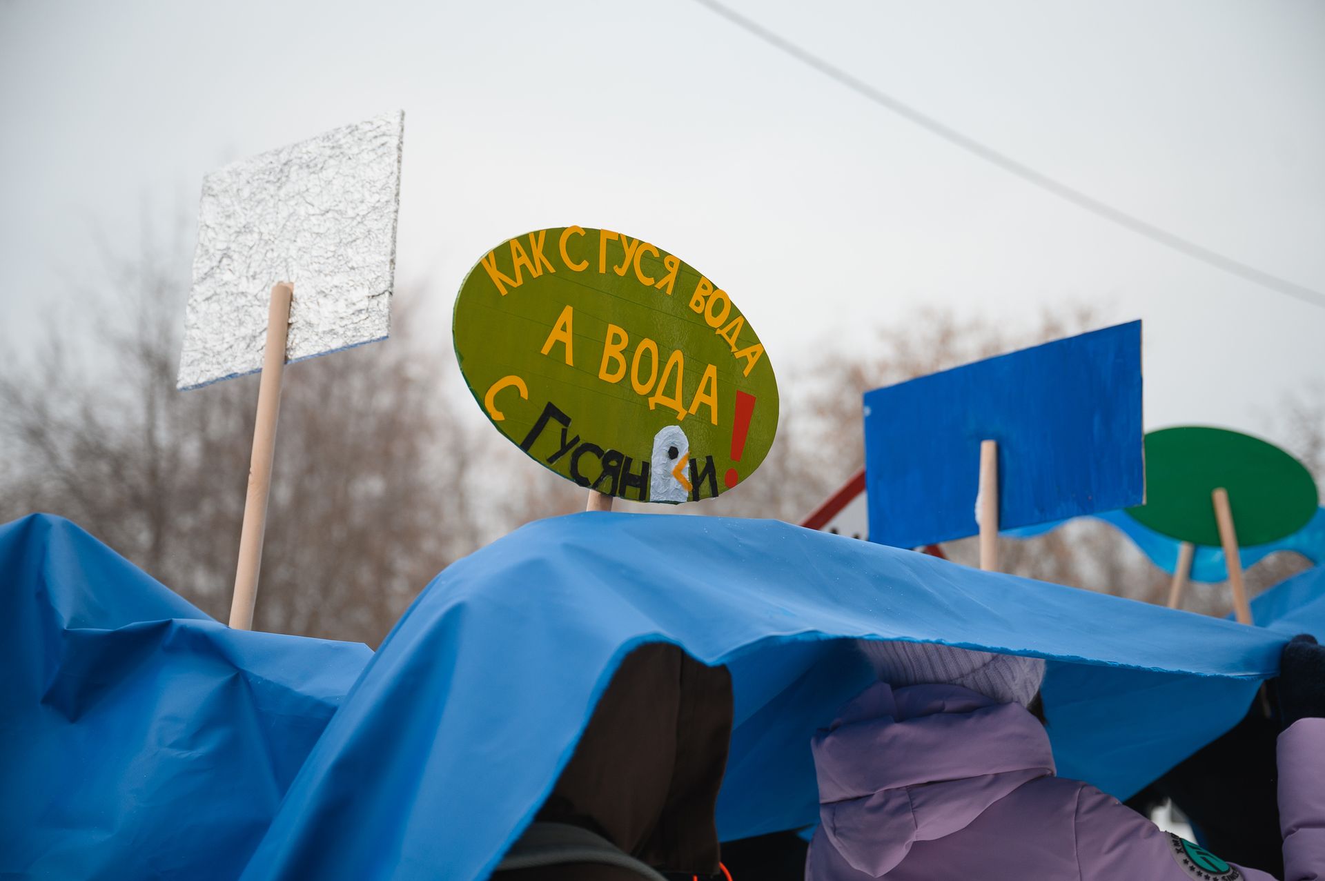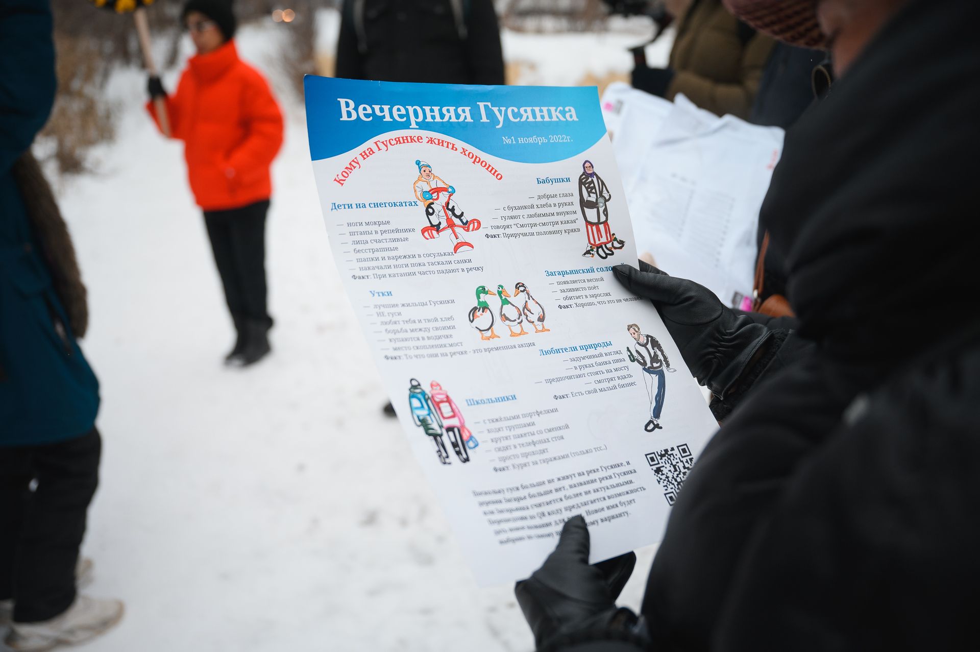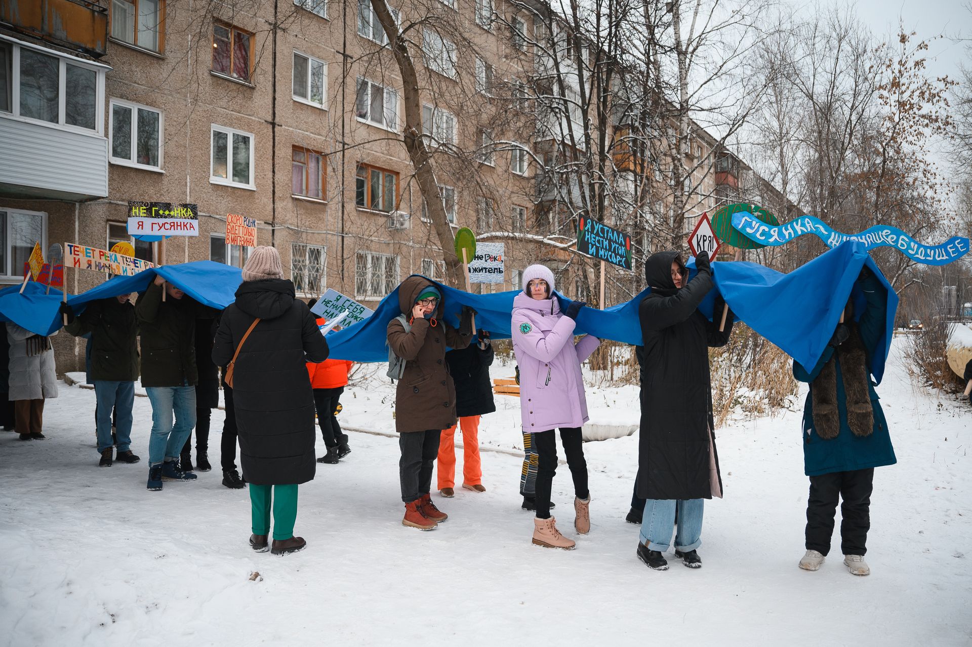 Завершением резиденции и стала массовая акция на берегу Гусянки 27 ноября. Местные экоактивисты выстроились под голубым полотнищем, изображающим реку, ощетинились транспарантами и с песнями двинулись к реке, по пути раздавая всем прохожим самодельную газету «Вечерняя Гусянка».