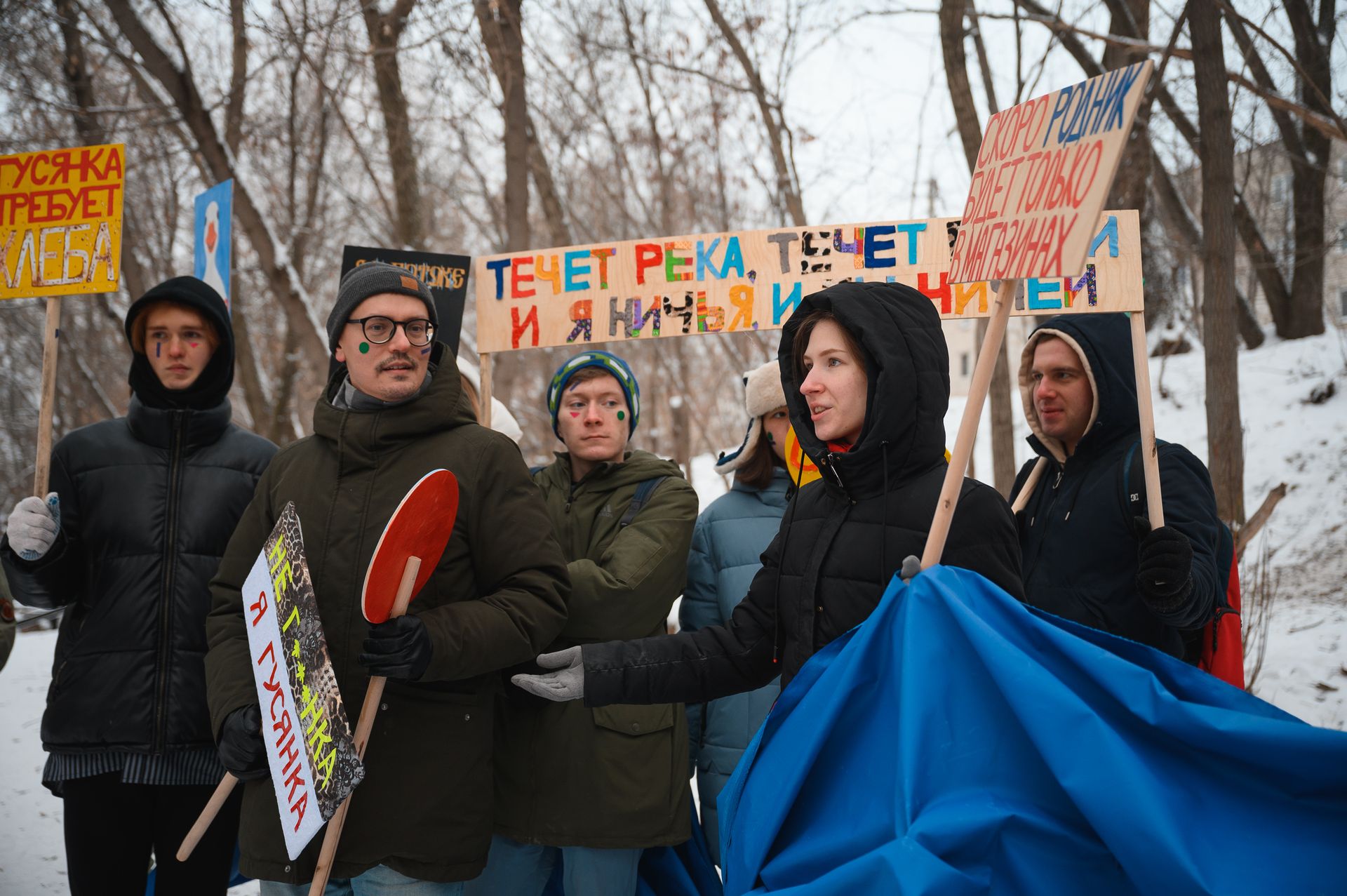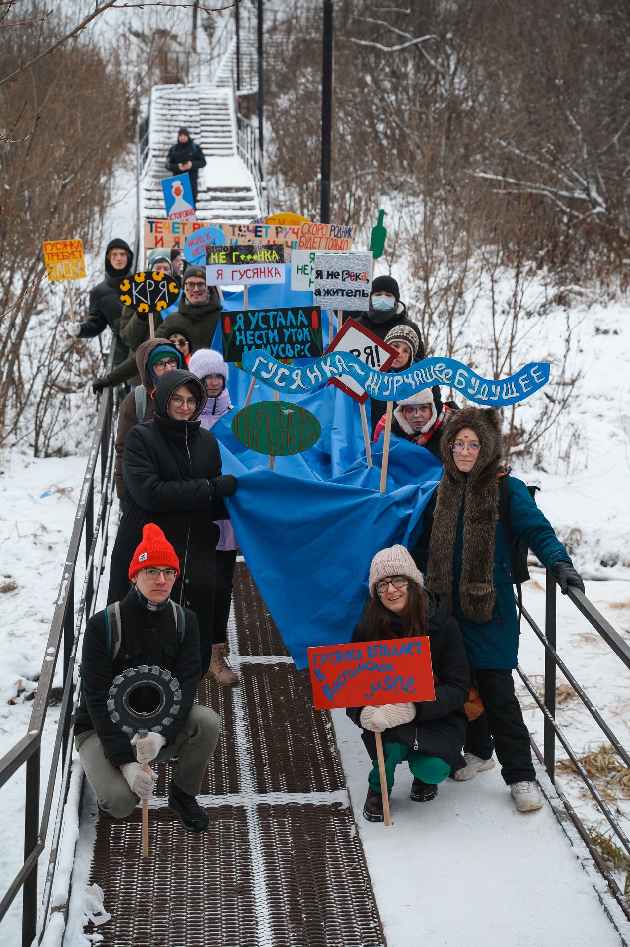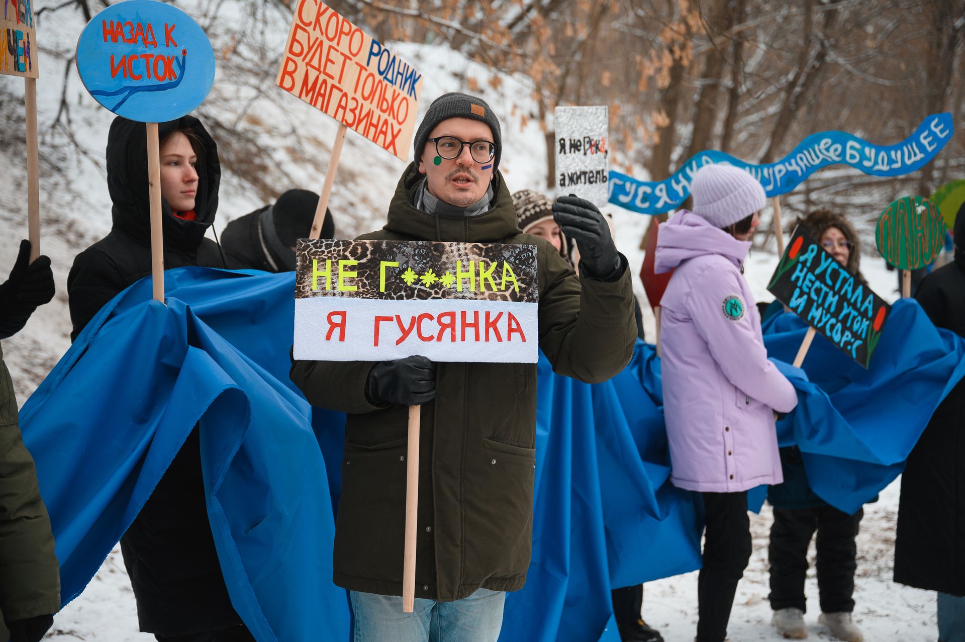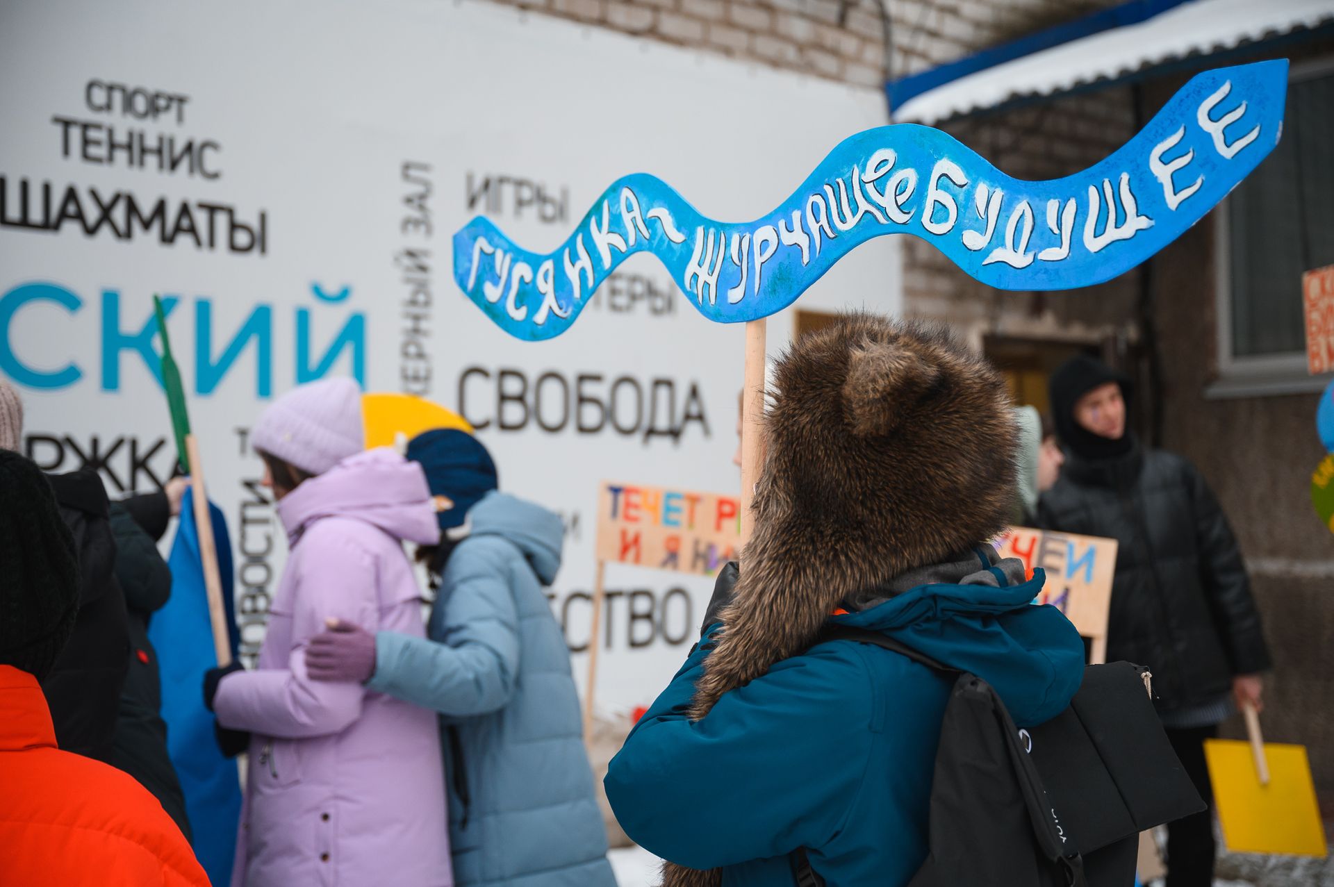 Завершением резиденции и стала массовая акция на берегу Гусянки 27 ноября. Местные экоактивисты выстроились под голубым полотнищем, изображающим реку, ощетинились транспарантами и с песнями двинулись к реке, по пути раздавая всем прохожим самодельную газету «Вечерняя Гусянка».