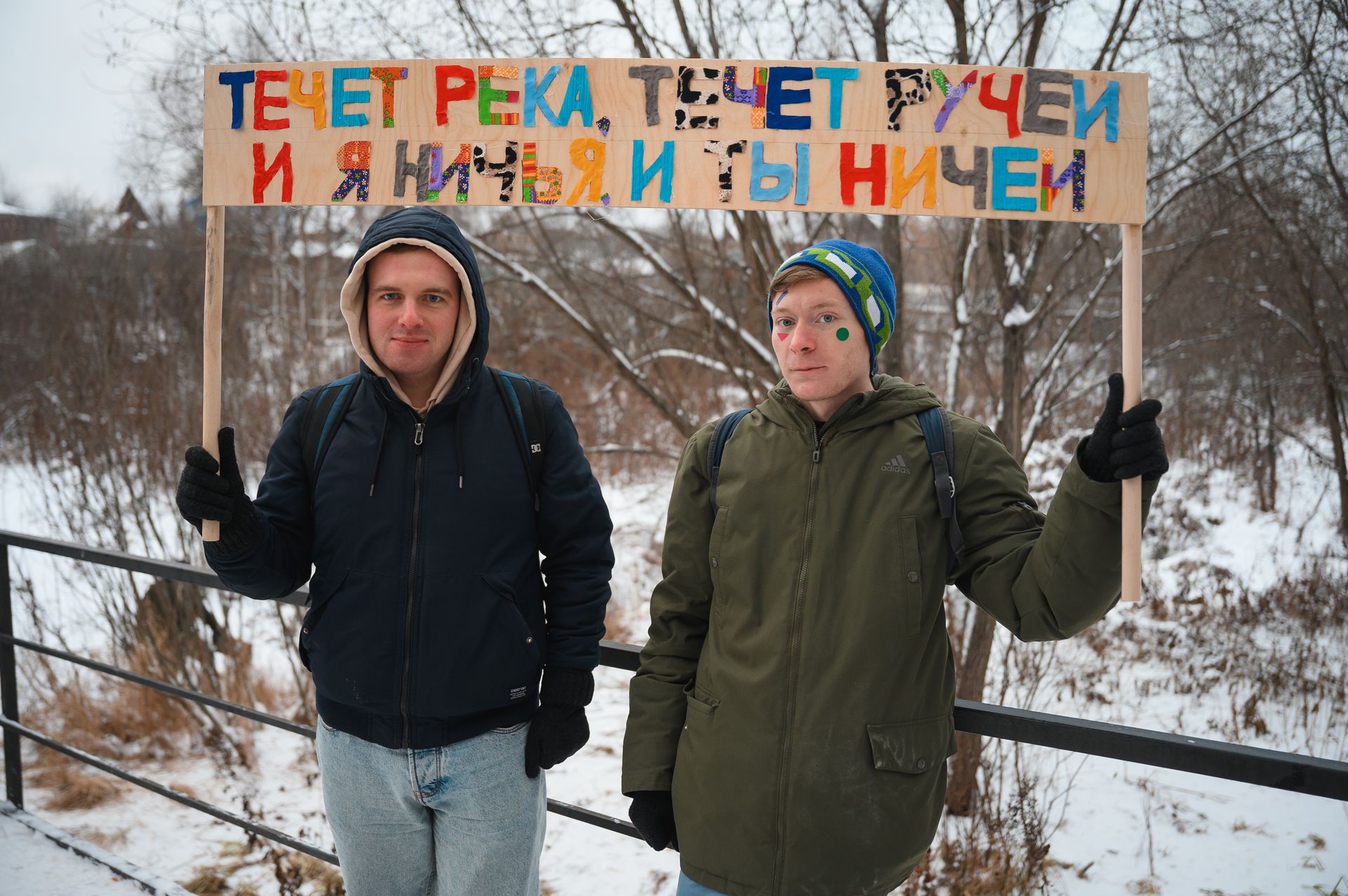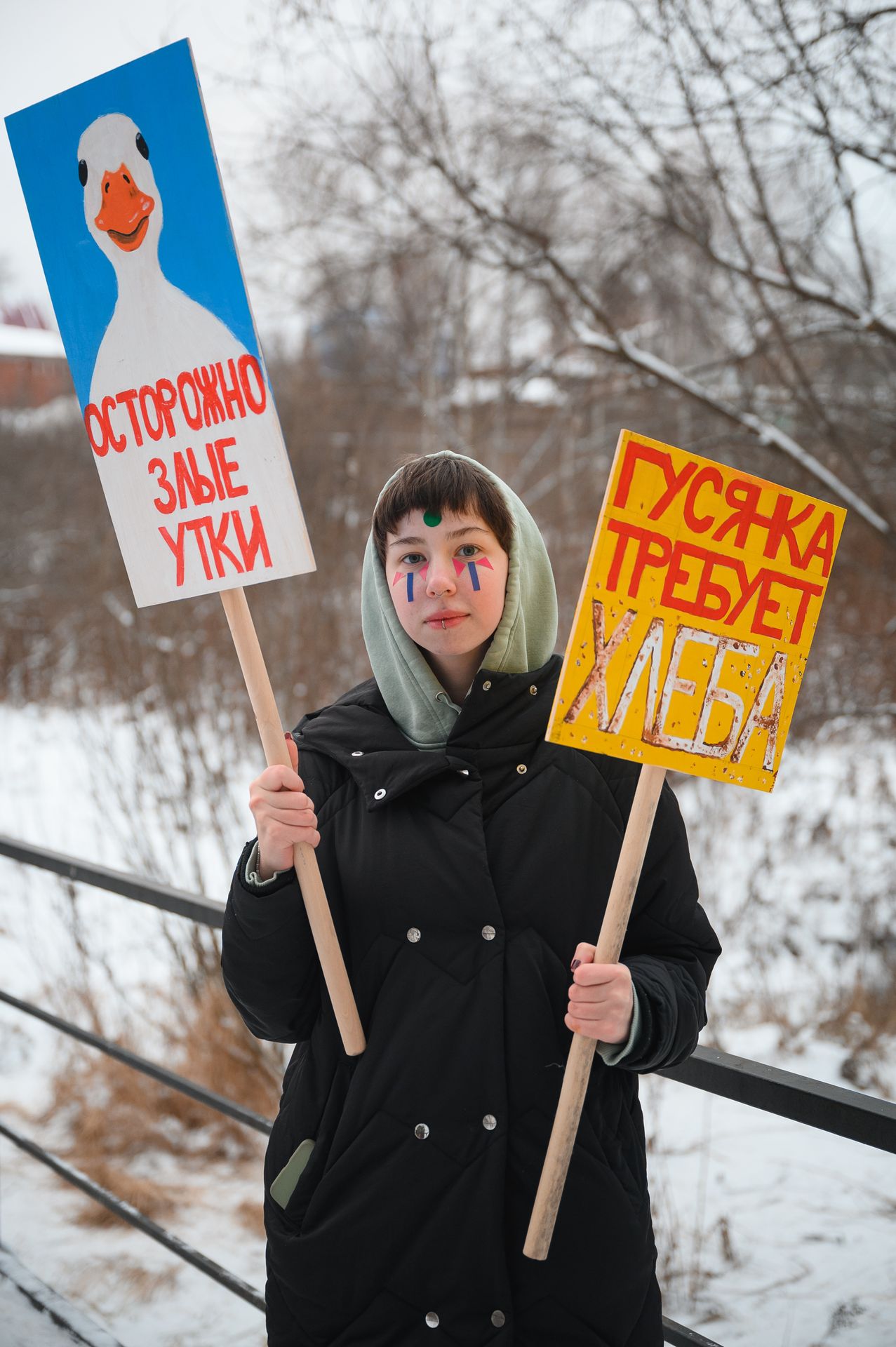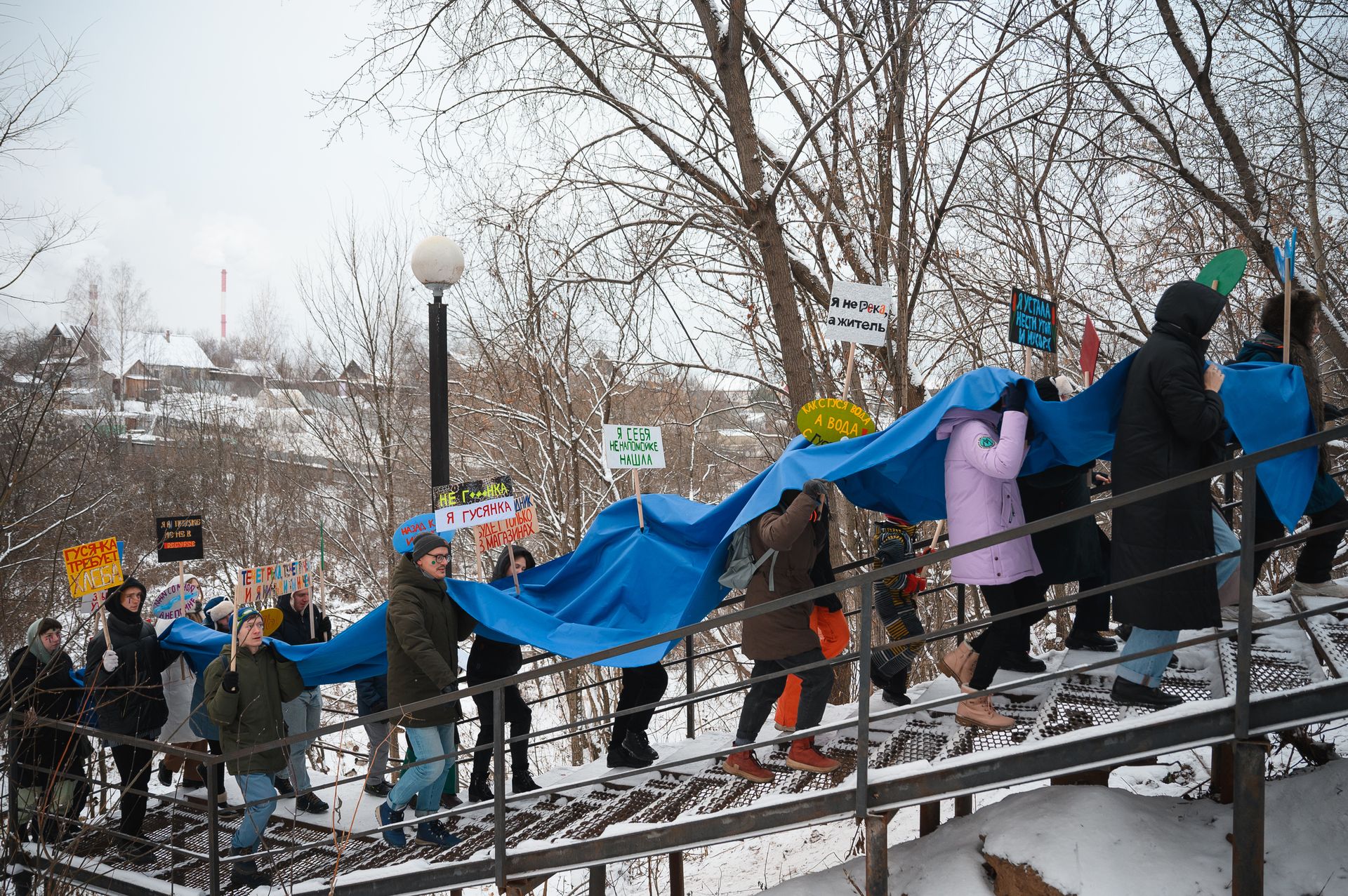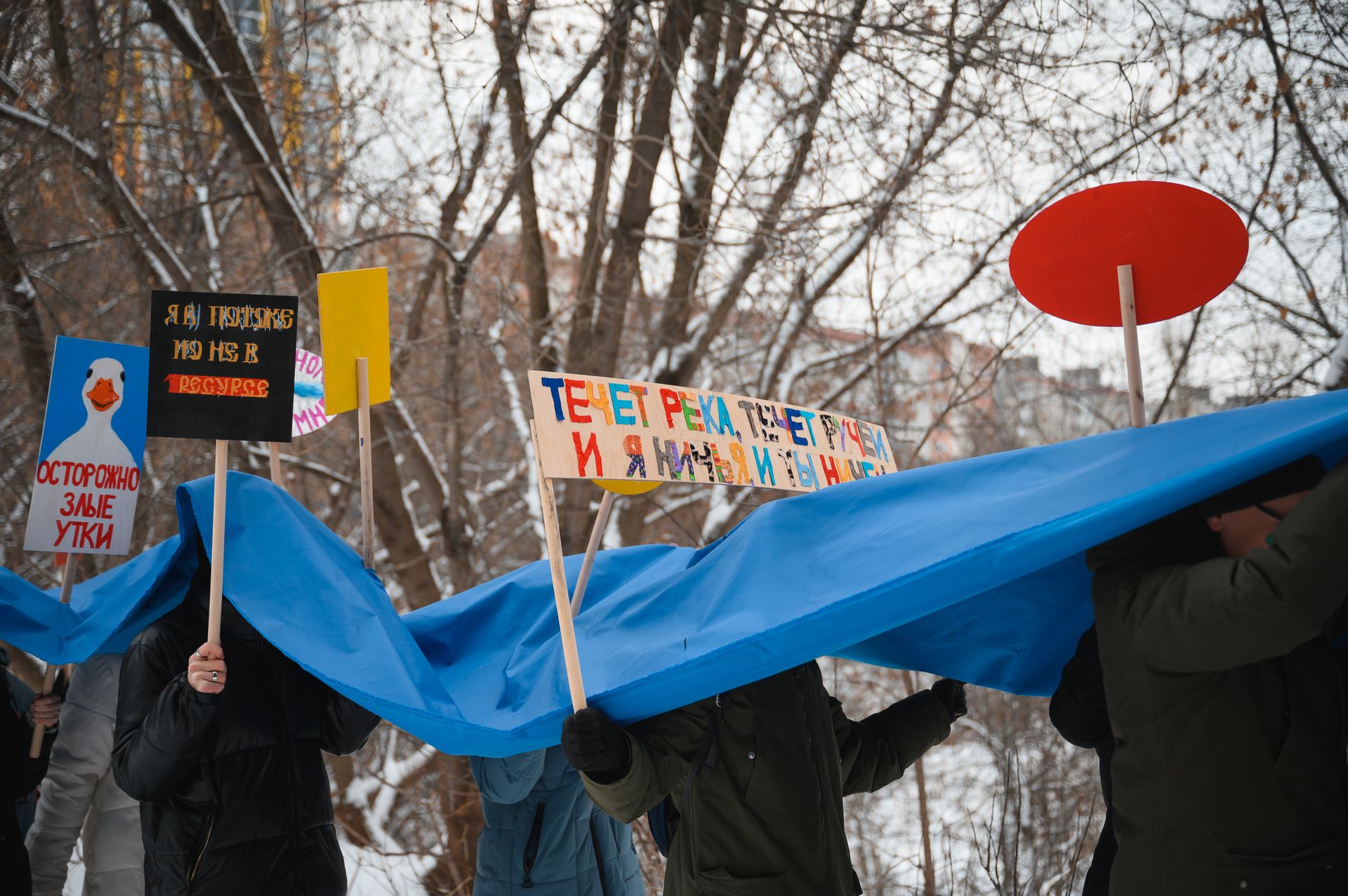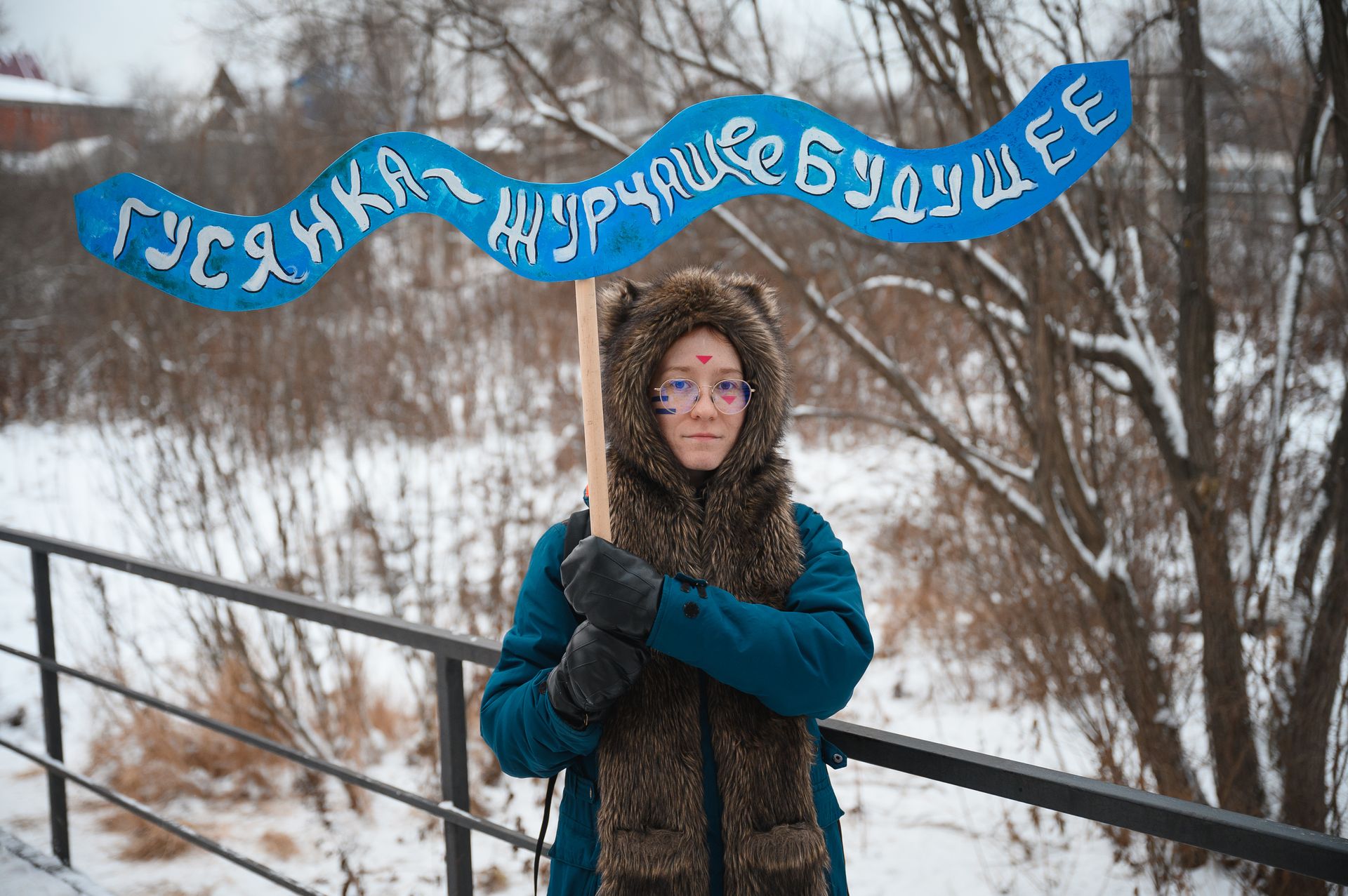 Завершением резиденции и стала массовая акция на берегу Гусянки 27 ноября. Местные экоактивисты выстроились под голубым полотнищем, изображающим реку, ощетинились транспарантами и с песнями двинулись к реке, по пути раздавая всем прохожим самодельную газету «Вечерняя Гусянка».