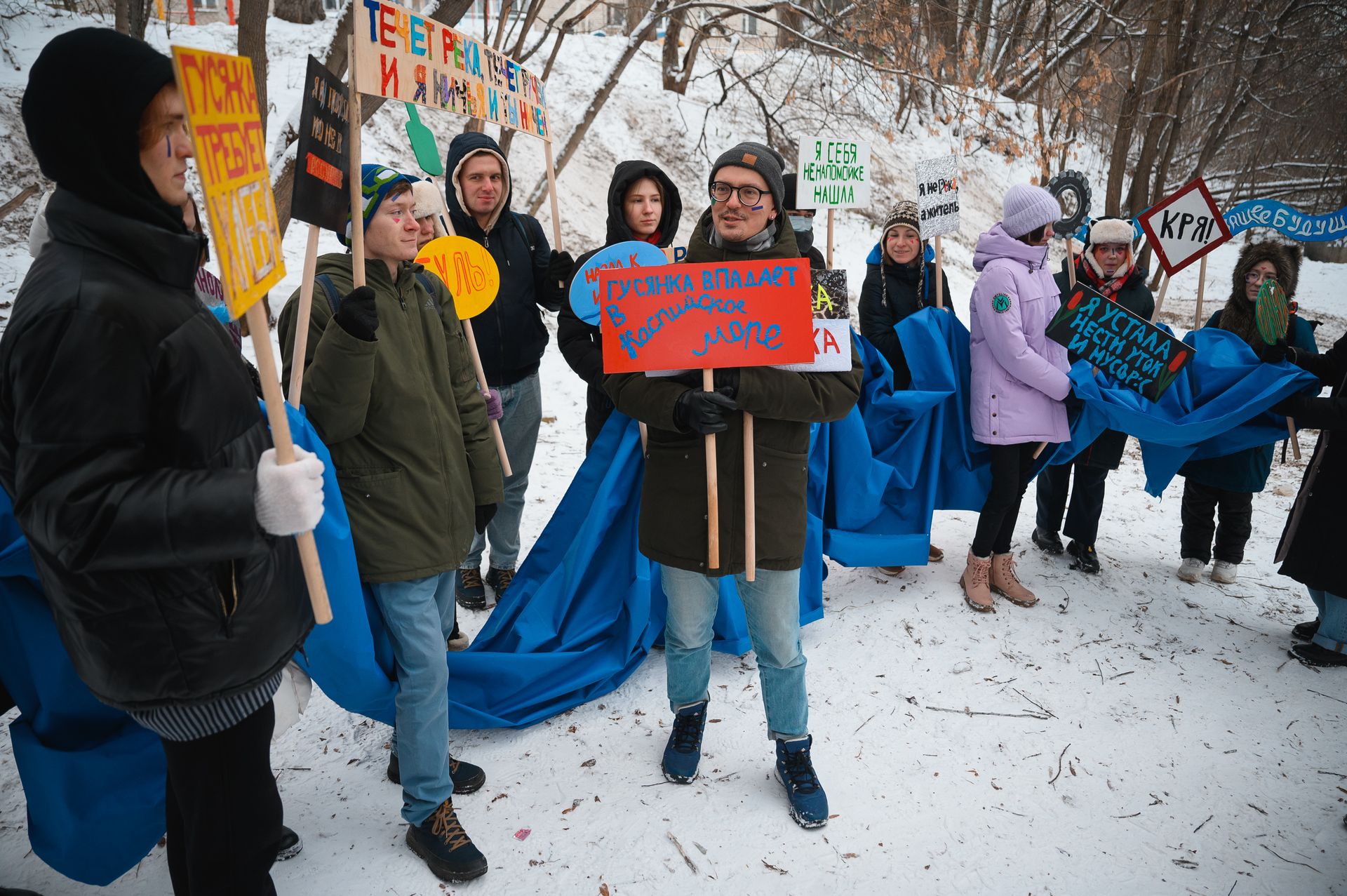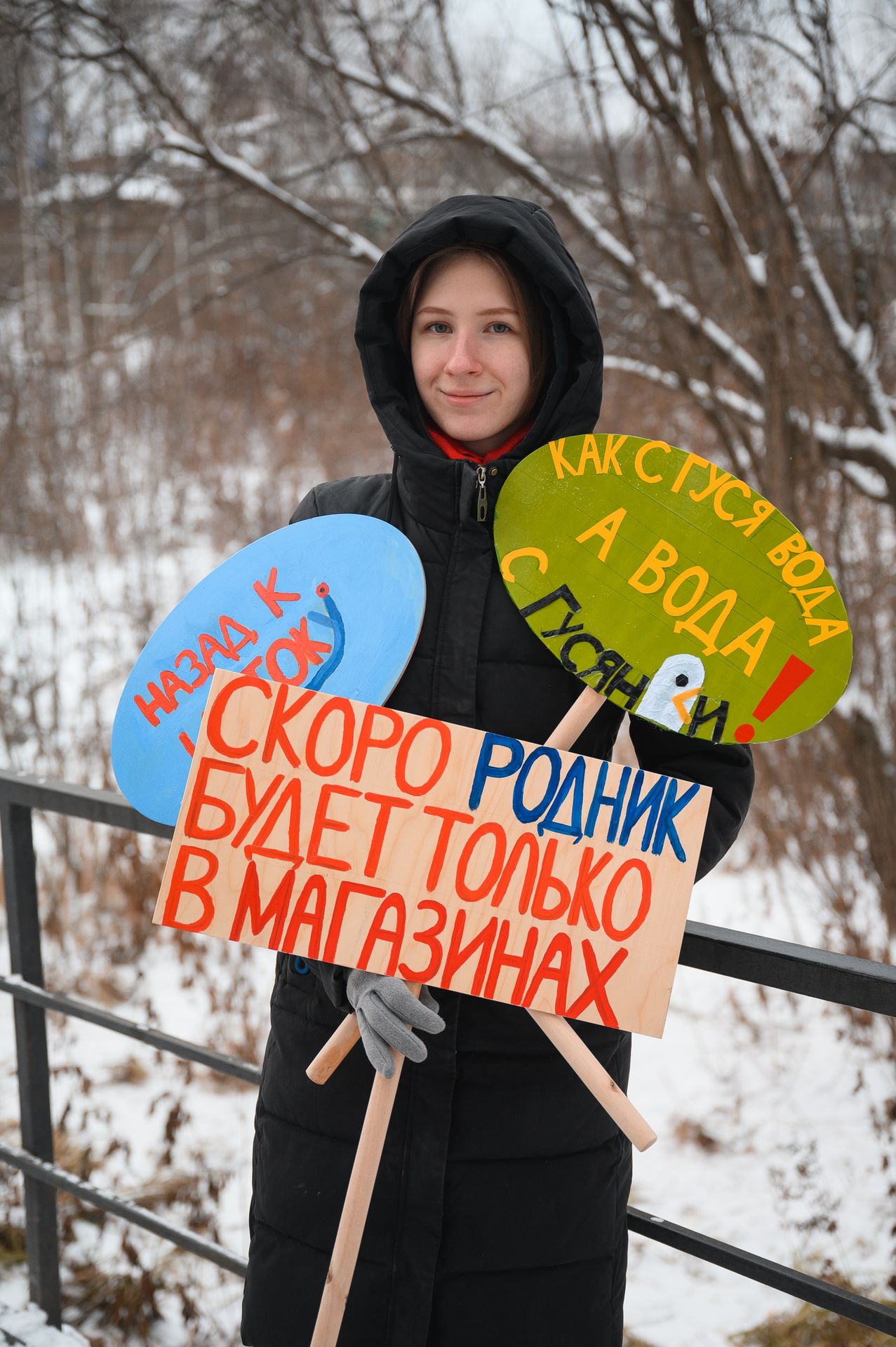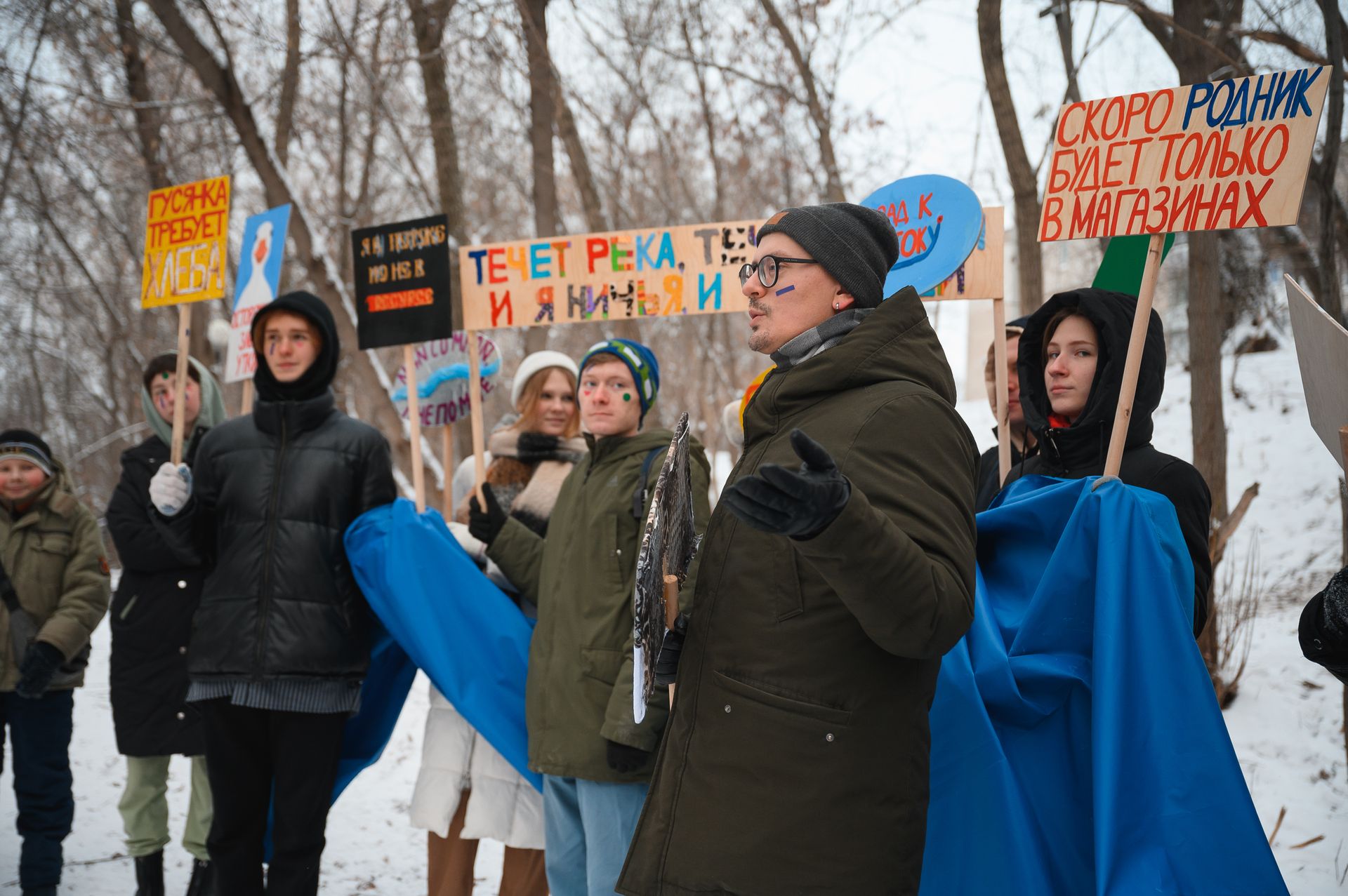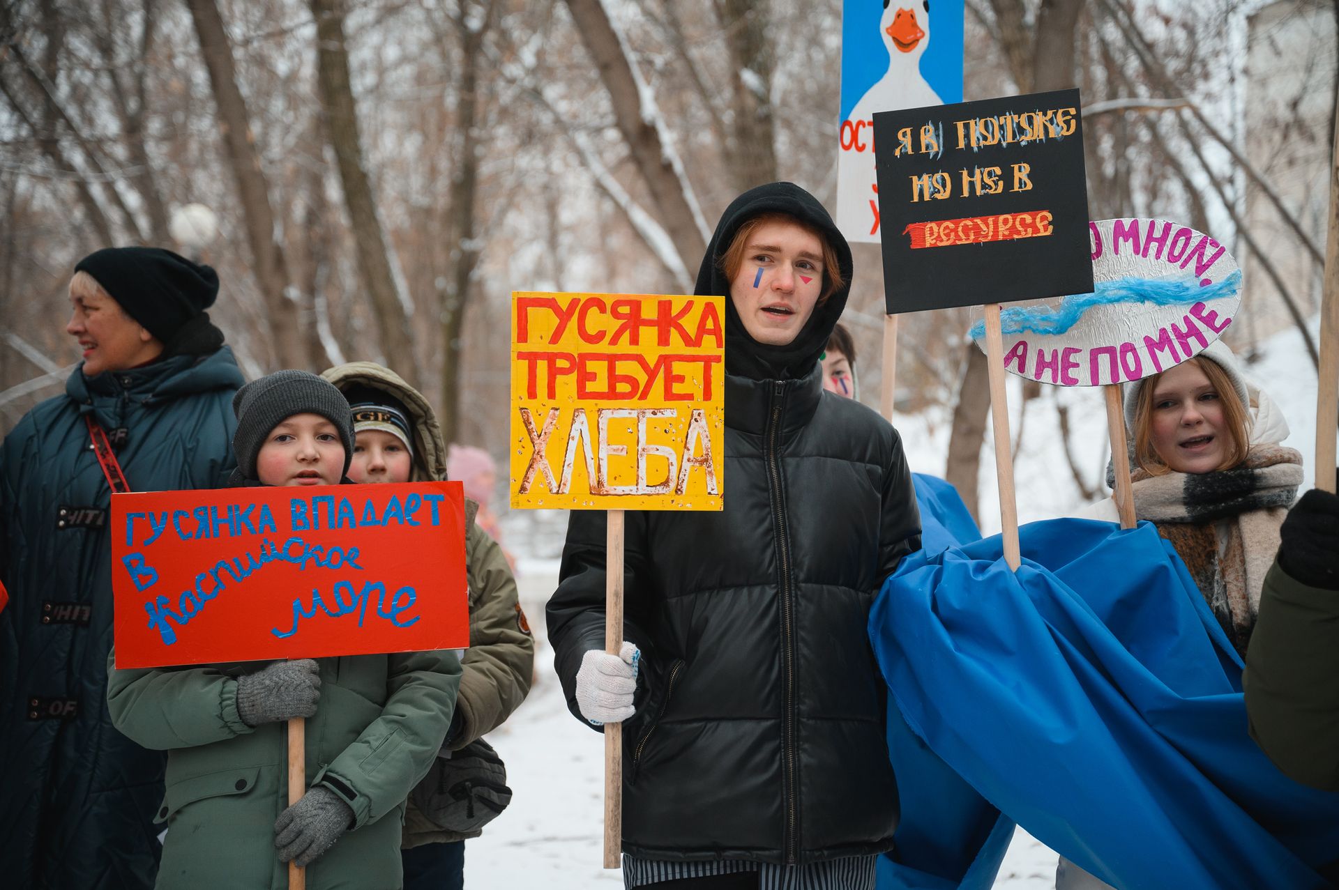 Завершением резиденции и стала массовая акция на берегу Гусянки 27 ноября. Местные экоактивисты выстроились под голубым полотнищем, изображающим реку, ощетинились транспарантами и с песнями двинулись к реке, по пути раздавая всем прохожим самодельную газету «Вечерняя Гусянка».