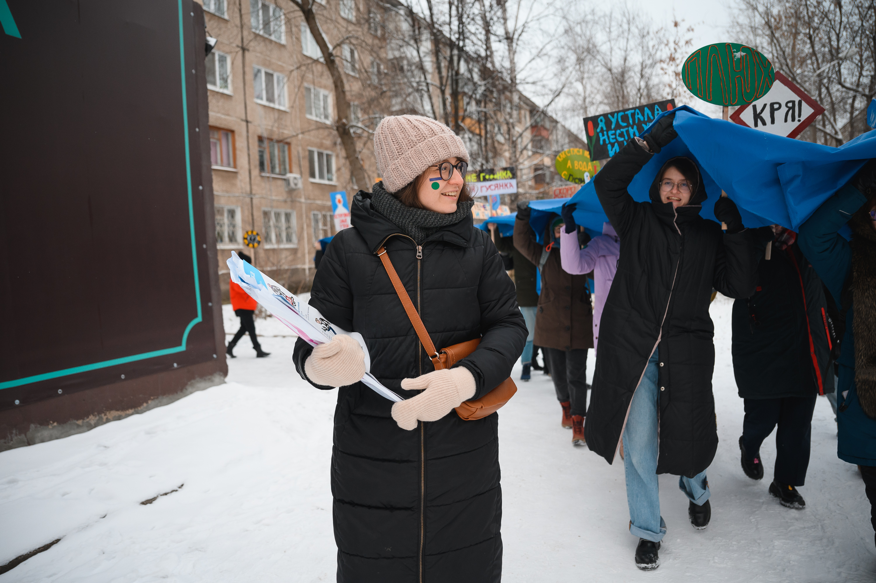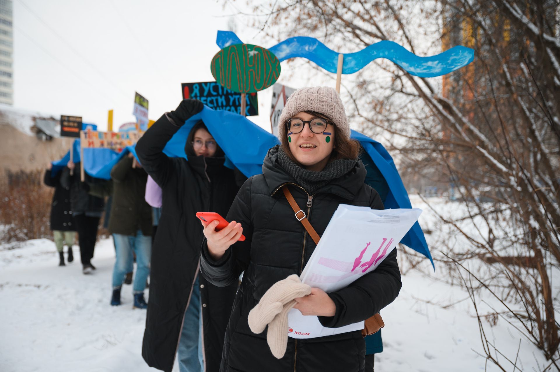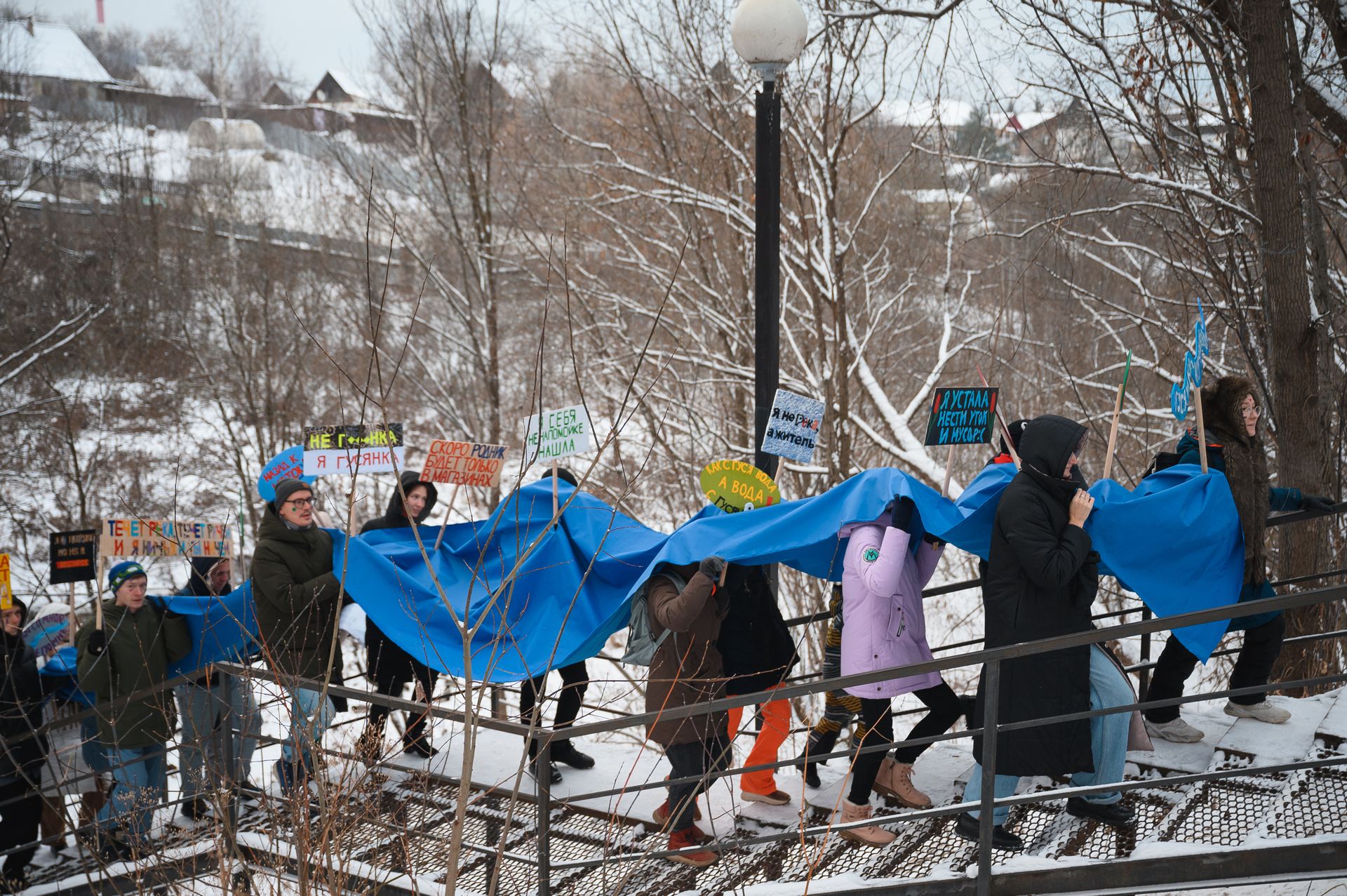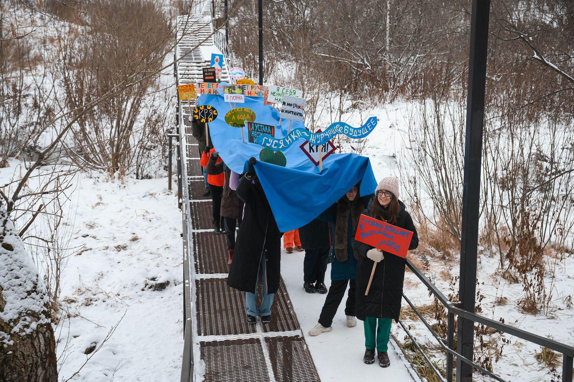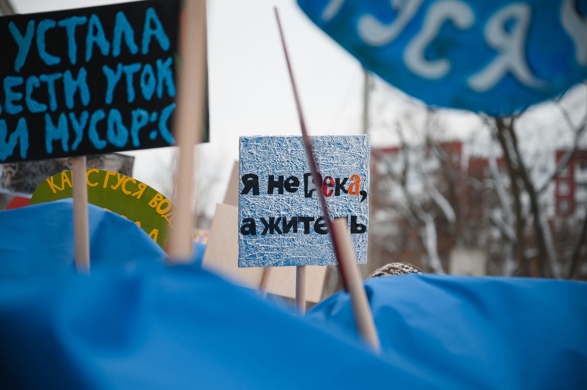 Завершением резиденции и стала массовая акция на берегу Гусянки 27 ноября. Местные экоактивисты выстроились под голубым полотнищем, изображающим реку, ощетинились транспарантами и с песнями двинулись к реке, по пути раздавая всем прохожим самодельную газету «Вечерняя Гусянка».