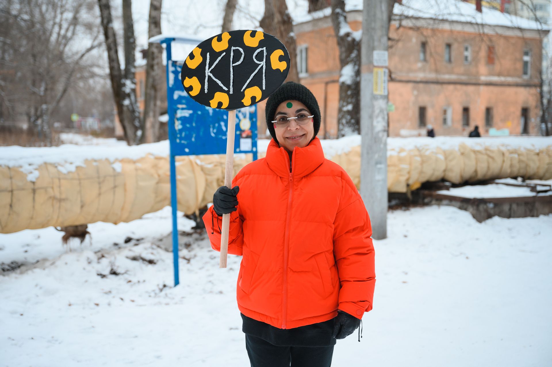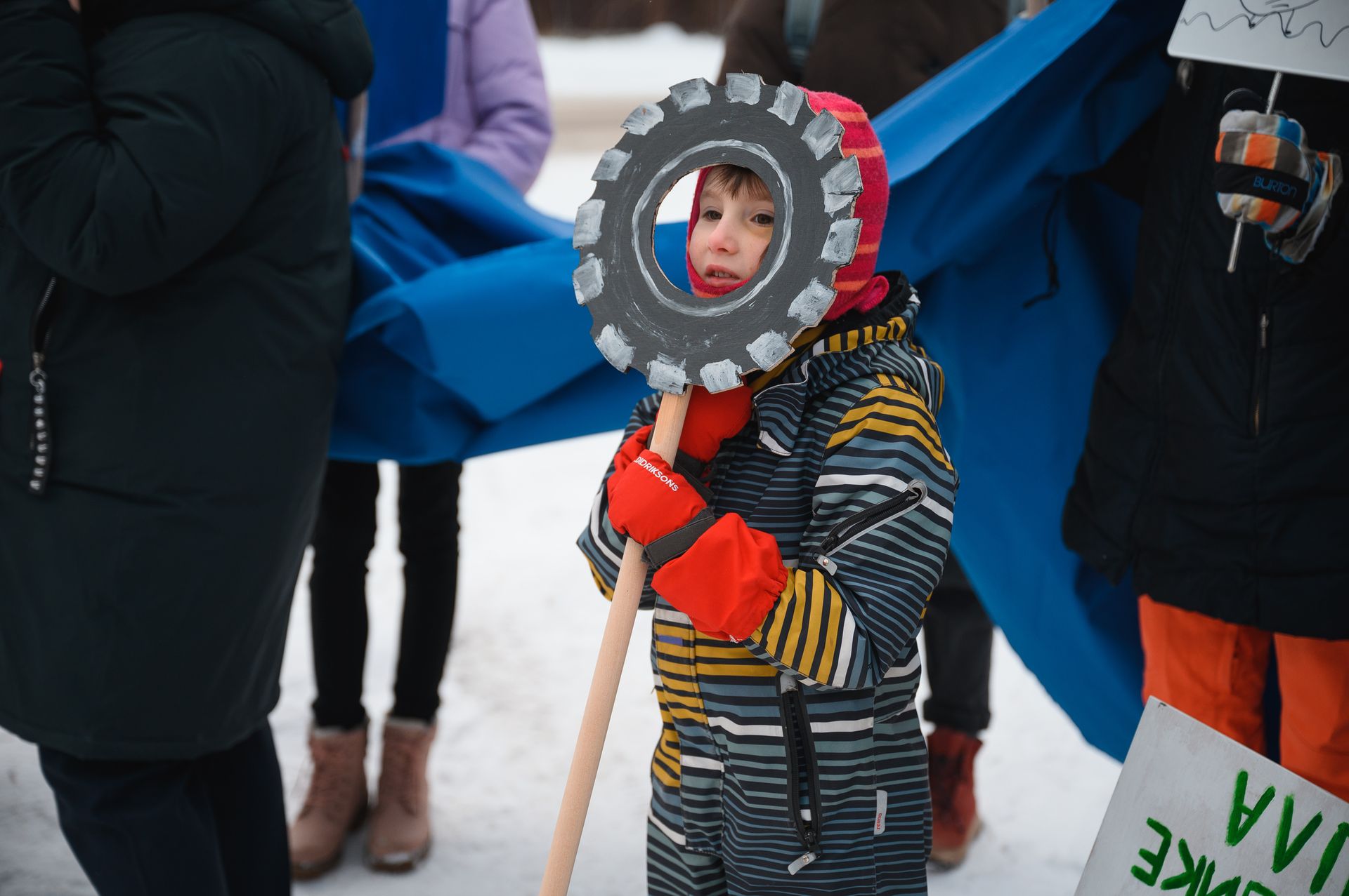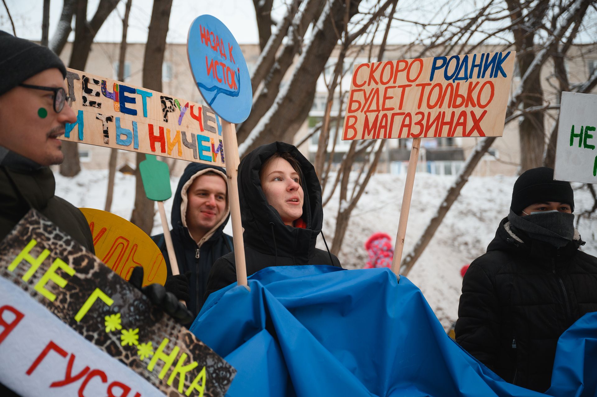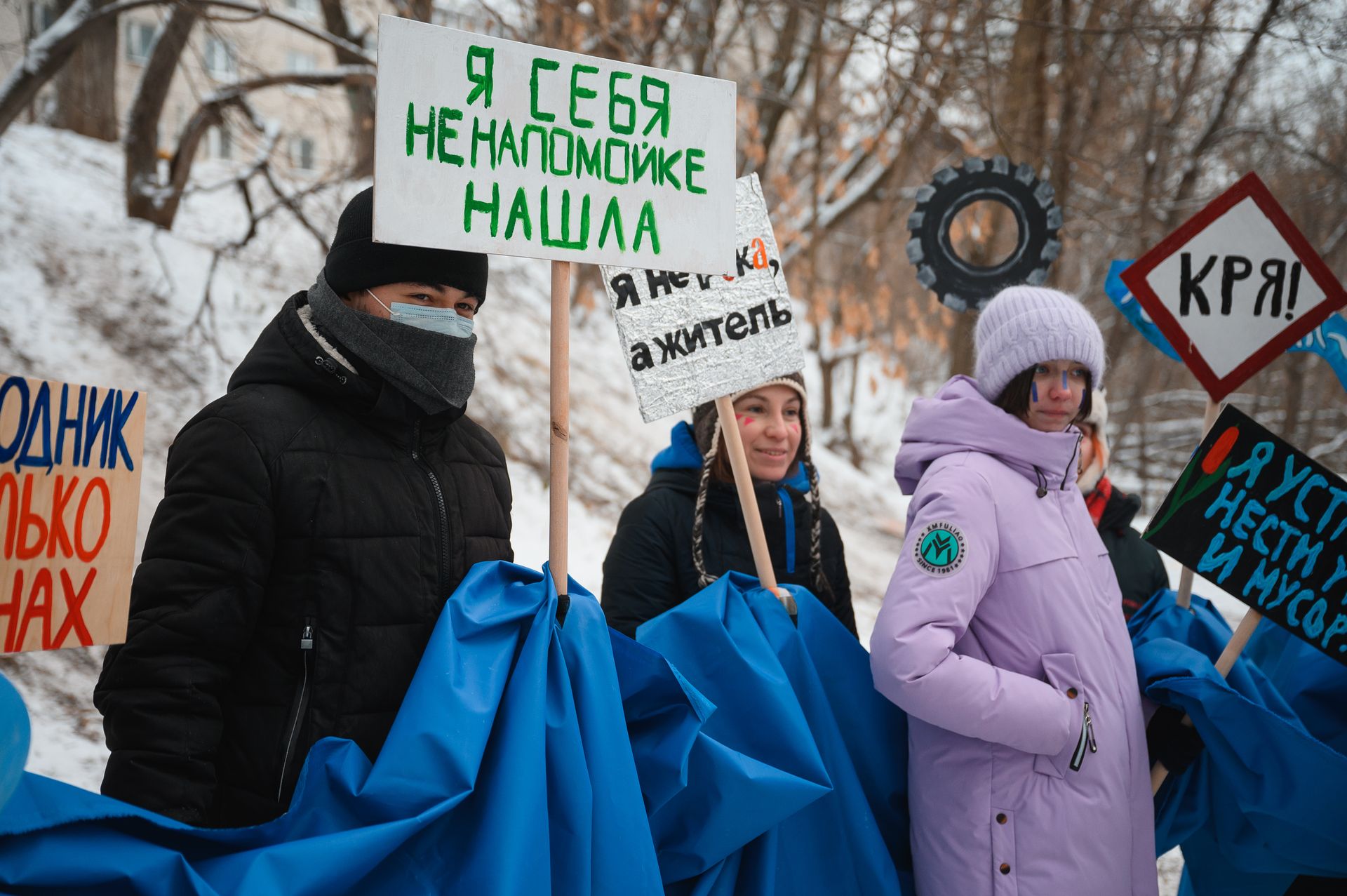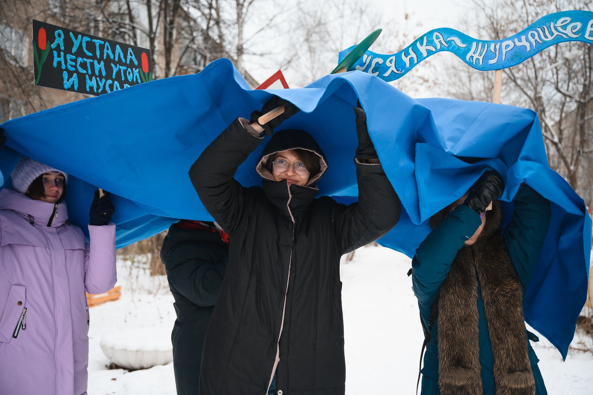 Завершением резиденции и стала массовая акция на берегу Гусянки 27 ноября. Местные экоактивисты выстроились под голубым полотнищем, изображающим реку, ощетинились транспарантами и с песнями двинулись к реке, по пути раздавая всем прохожим самодельную газету «Вечерняя Гусянка».