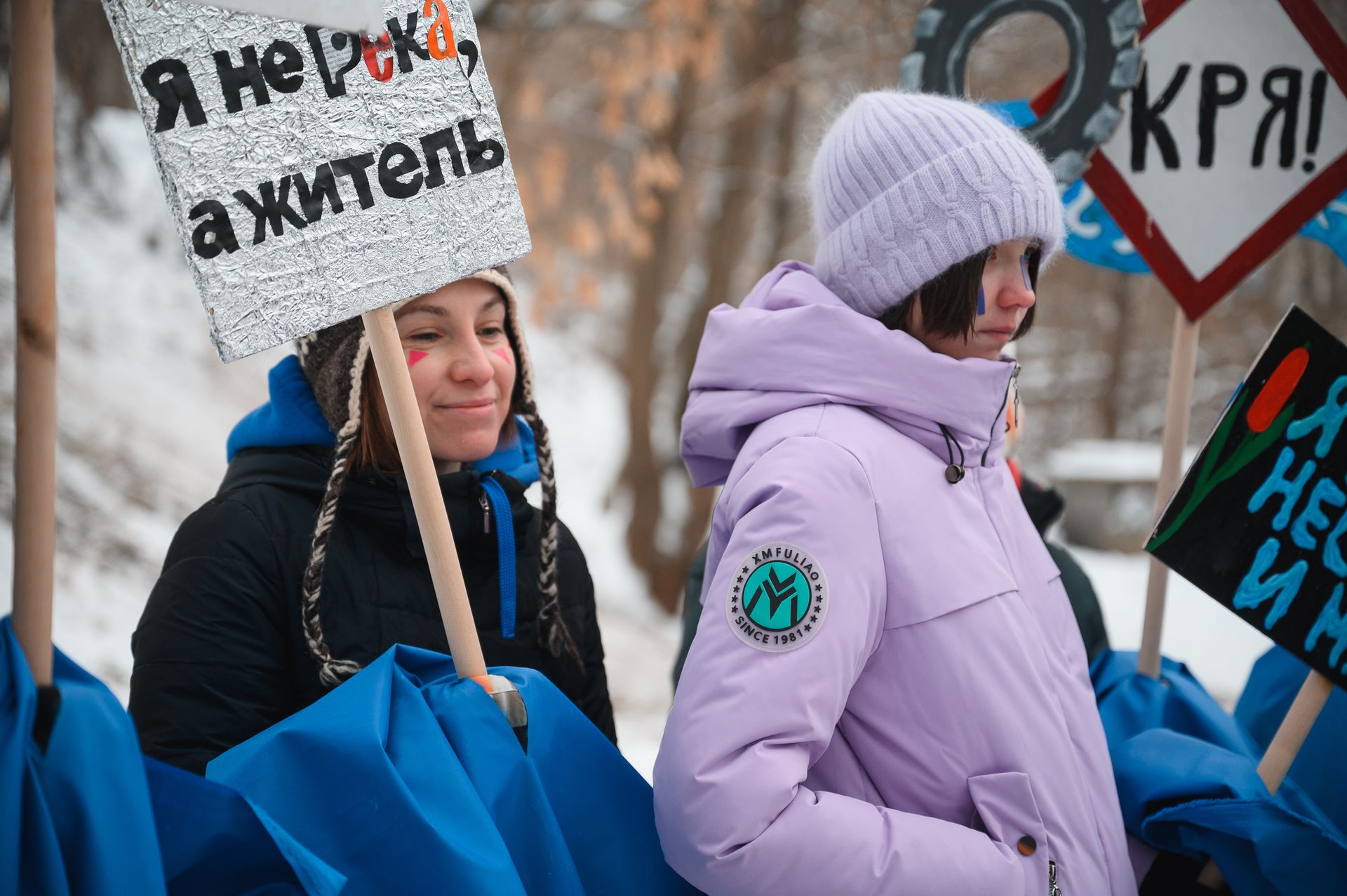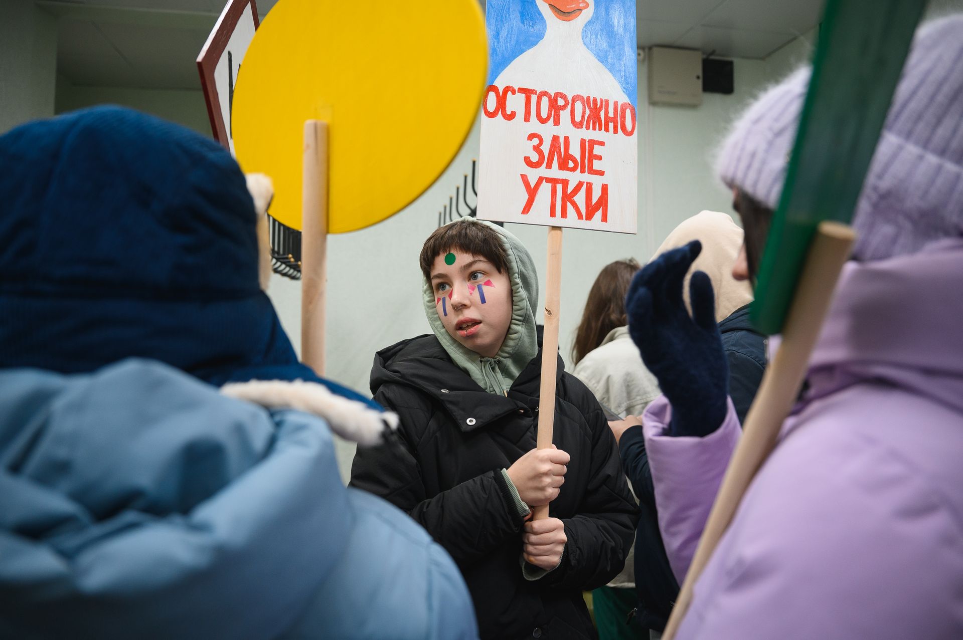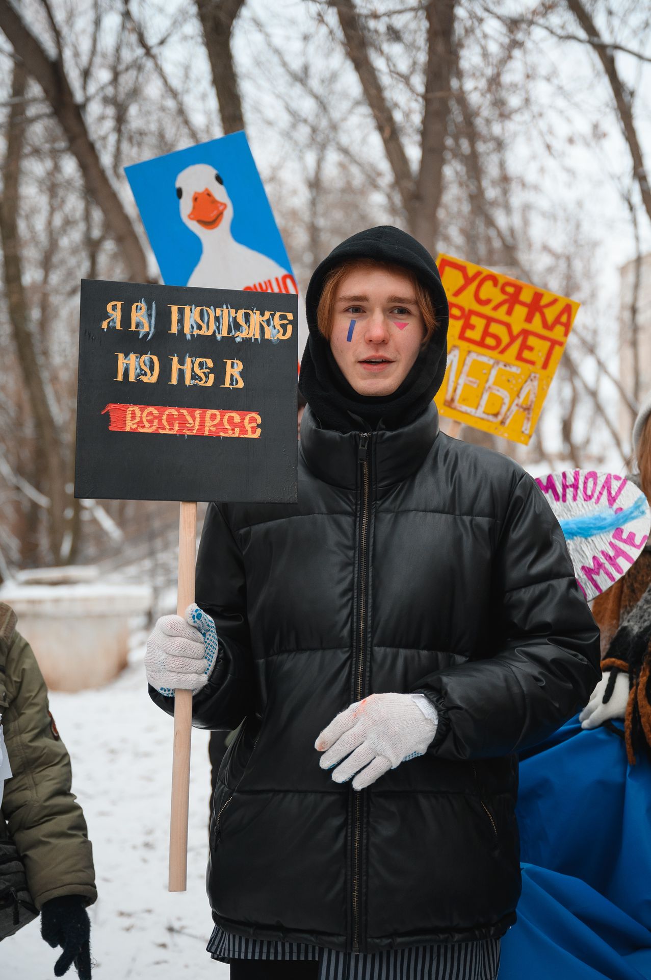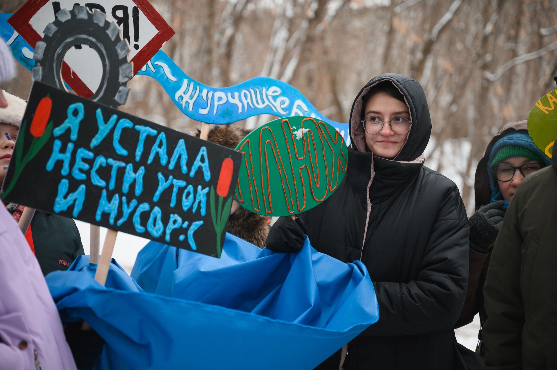 Завершением резиденции и стала массовая акция на берегу Гусянки 27 ноября. Местные экоактивисты выстроились под голубым полотнищем, изображающим реку, ощетинились транспарантами и с песнями двинулись к реке, по пути раздавая всем прохожим самодельную газету «Вечерняя Гусянка».
