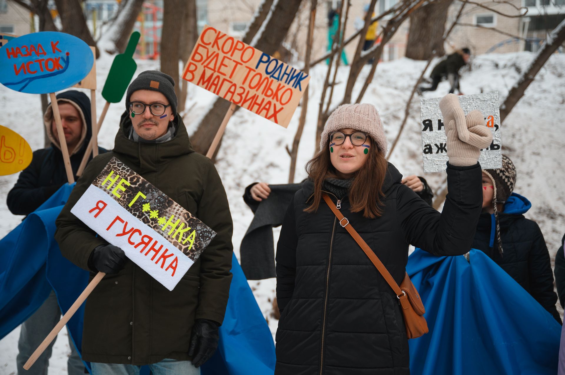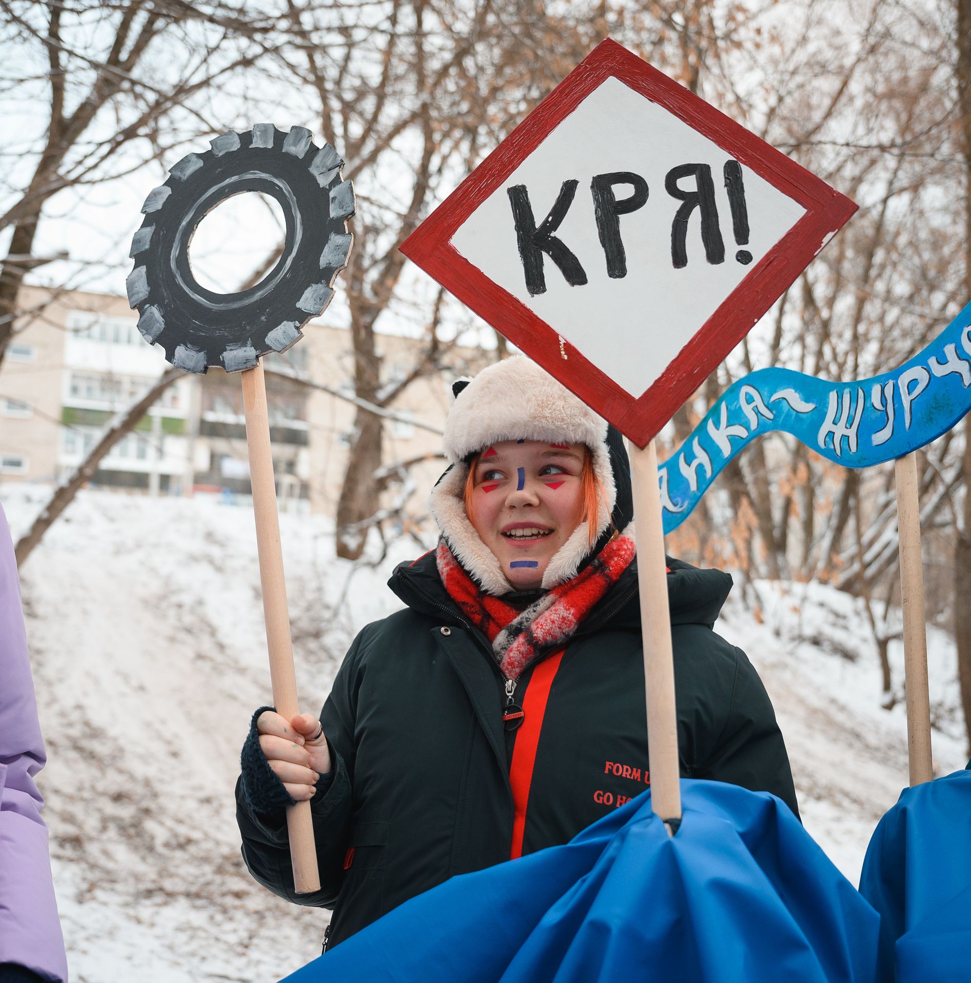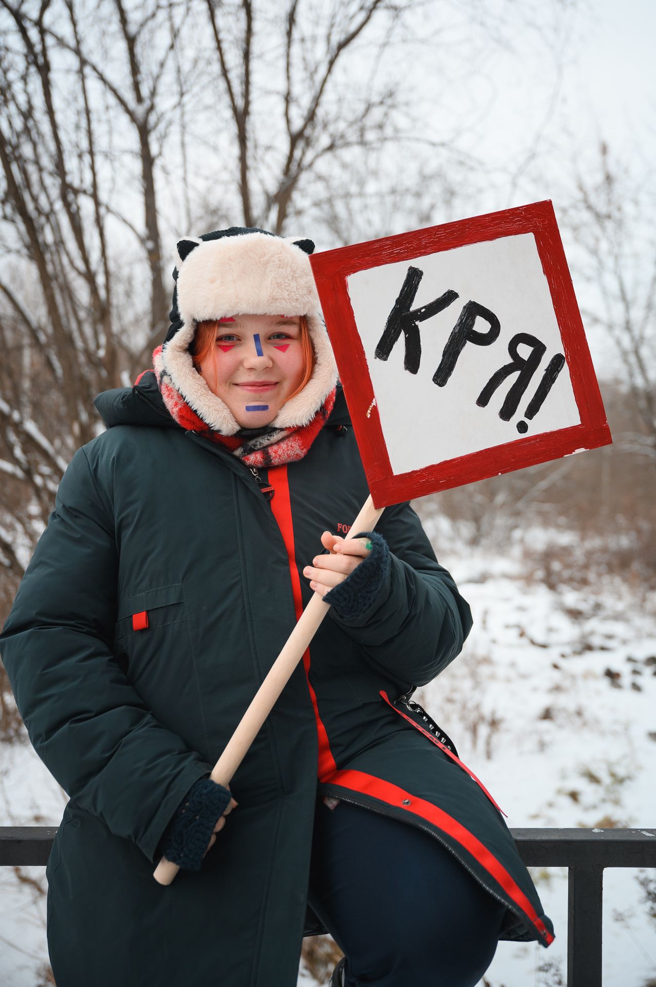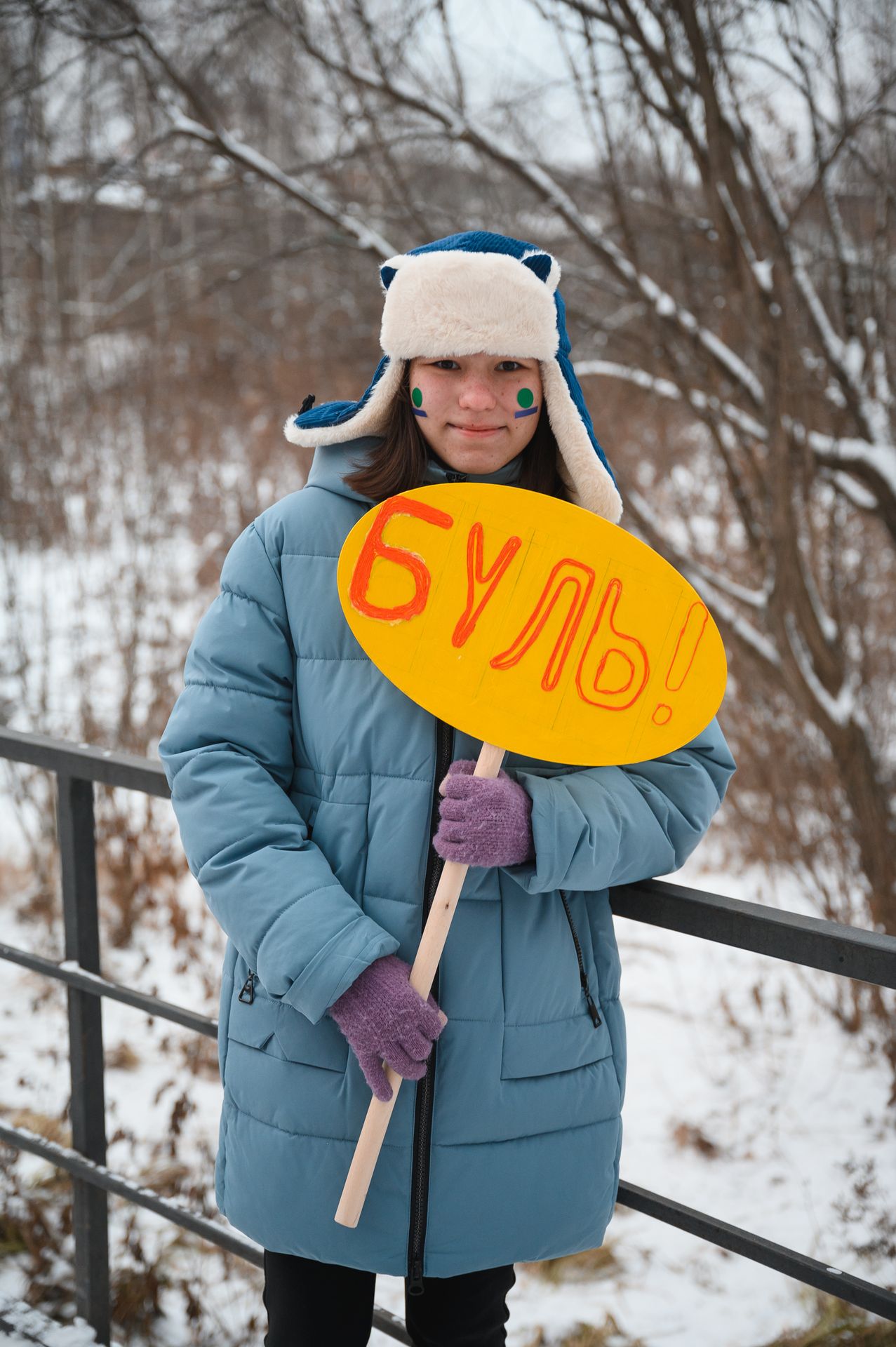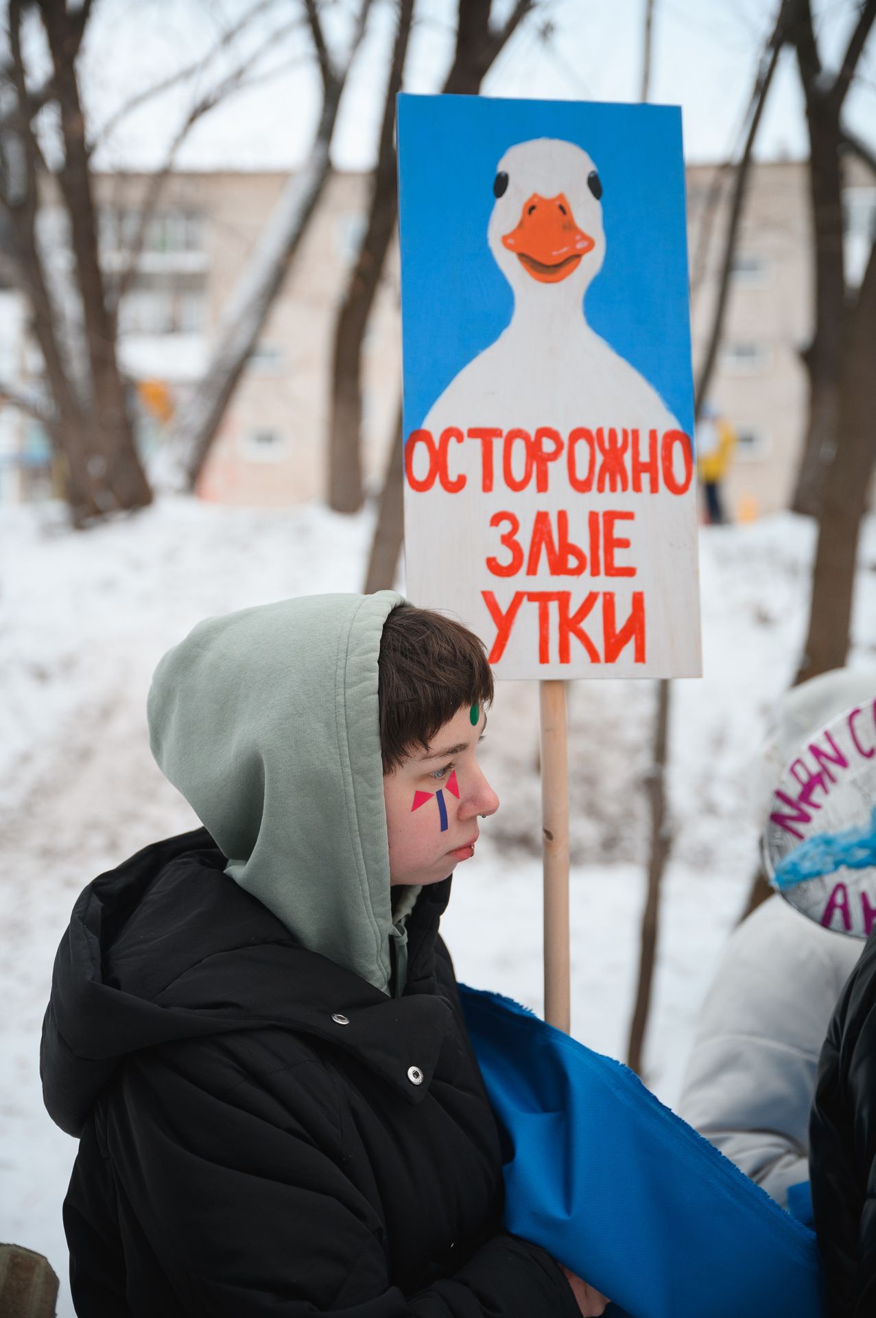 Завершением резиденции и стала массовая акция на берегу Гусянки 27 ноября. Местные экоактивисты выстроились под голубым полотнищем, изображающим реку, ощетинились транспарантами и с песнями двинулись к реке, по пути раздавая всем прохожим самодельную газету «Вечерняя Гусянка».