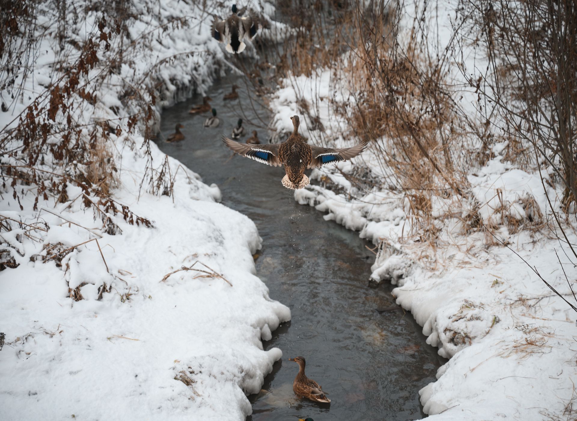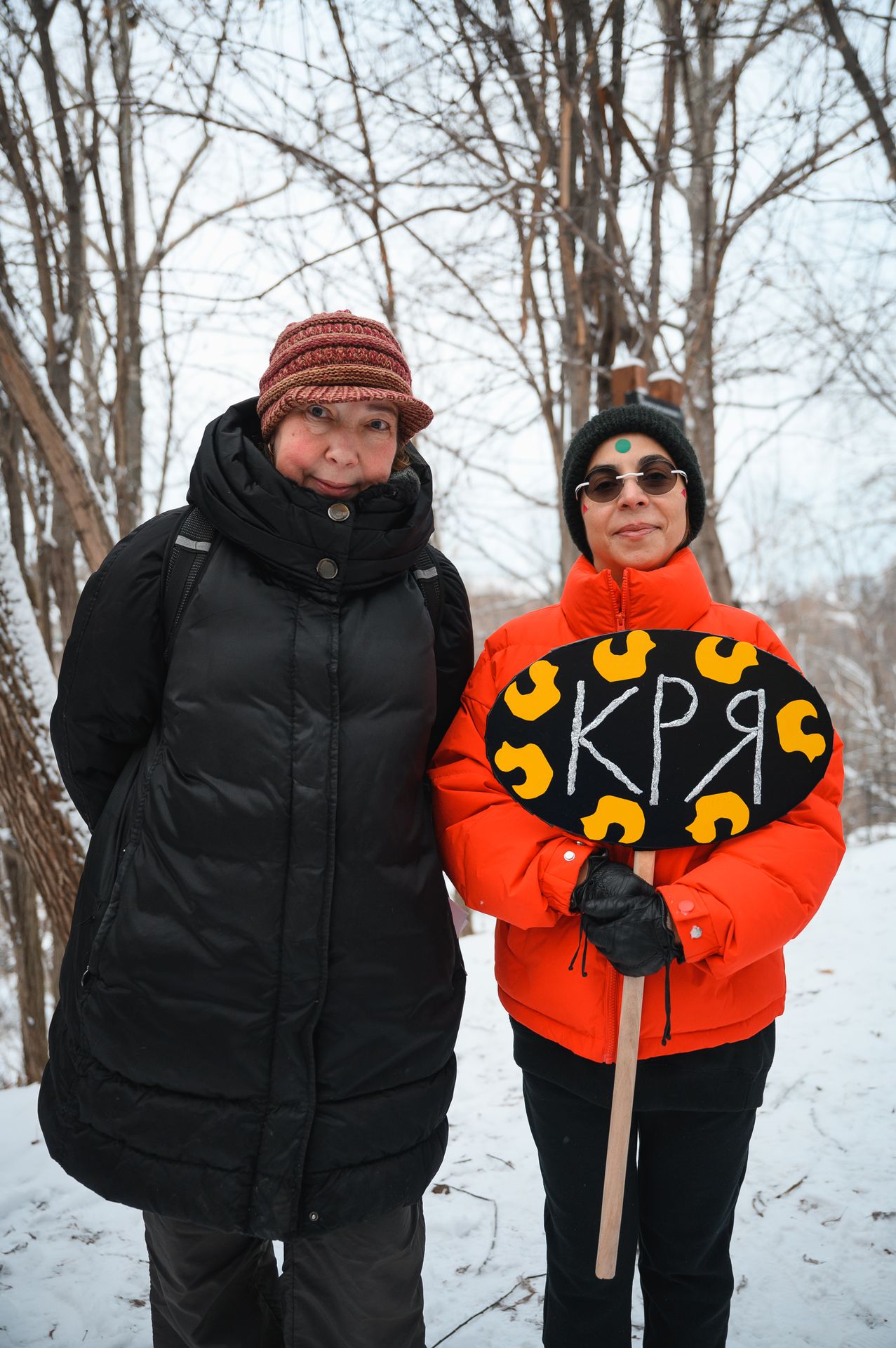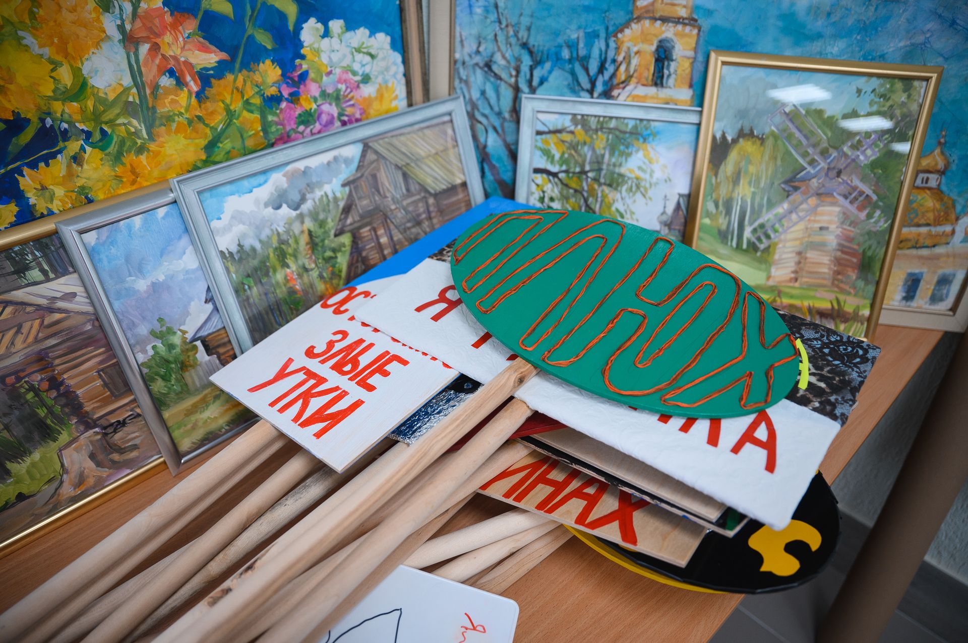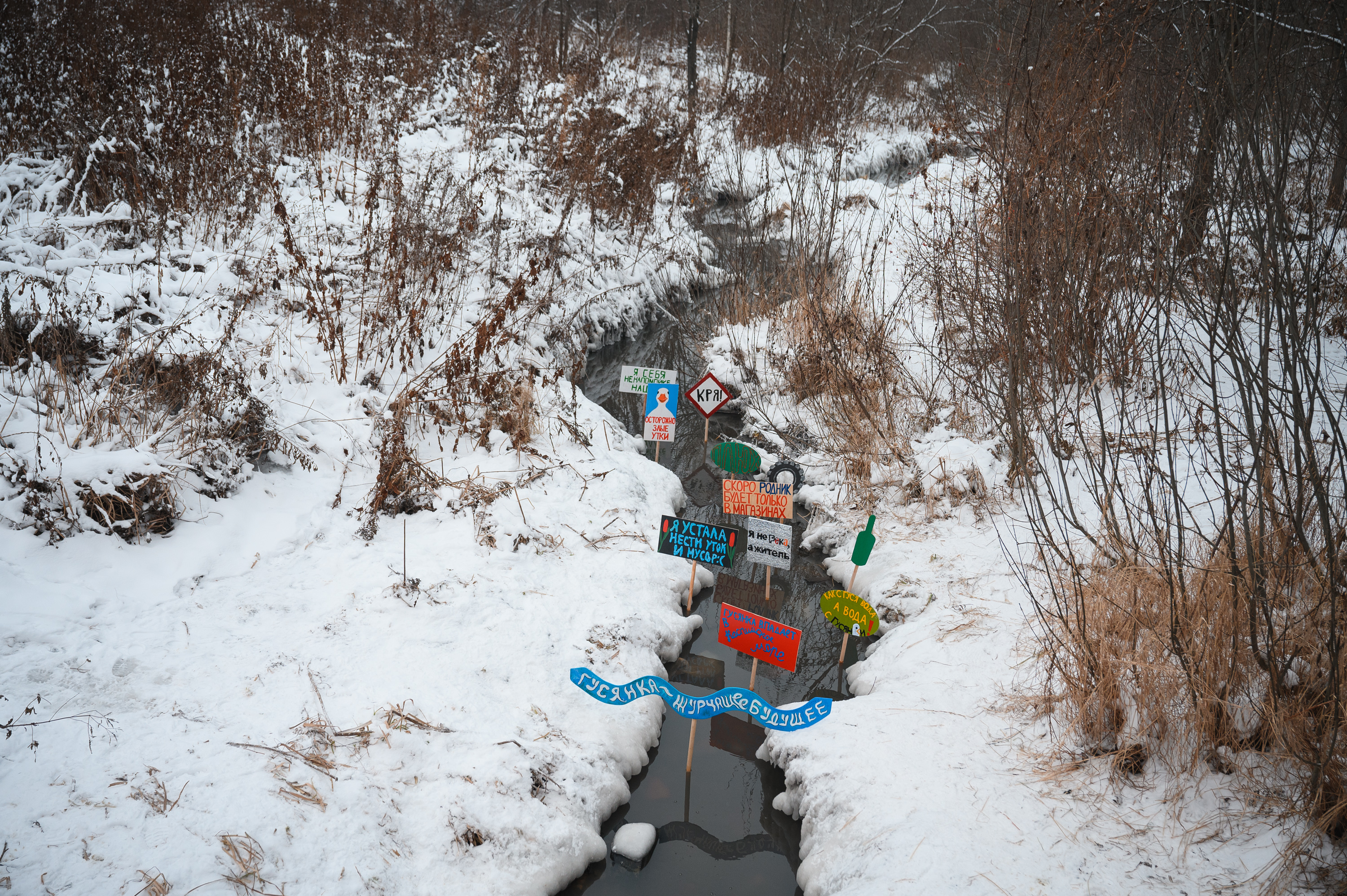 Завершением воскресной акции и всей арт-резиденции стало водружение транспарантов прямо в русло реки, как будто река-шествие перевоплотилась в реальную реку. Утки, которых здесь неисчислимое множество, испуганно взвились и начали красивый облёт территории.