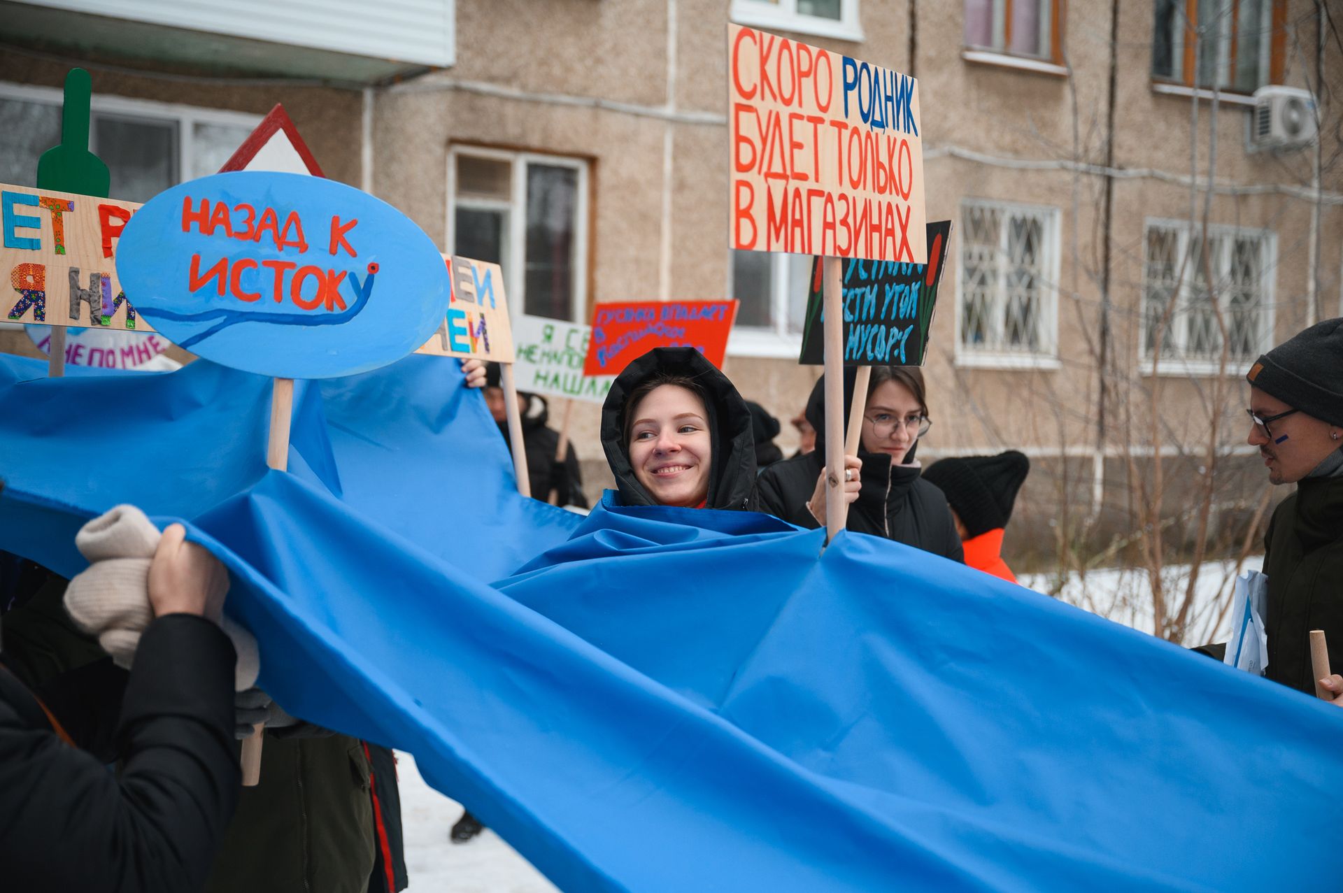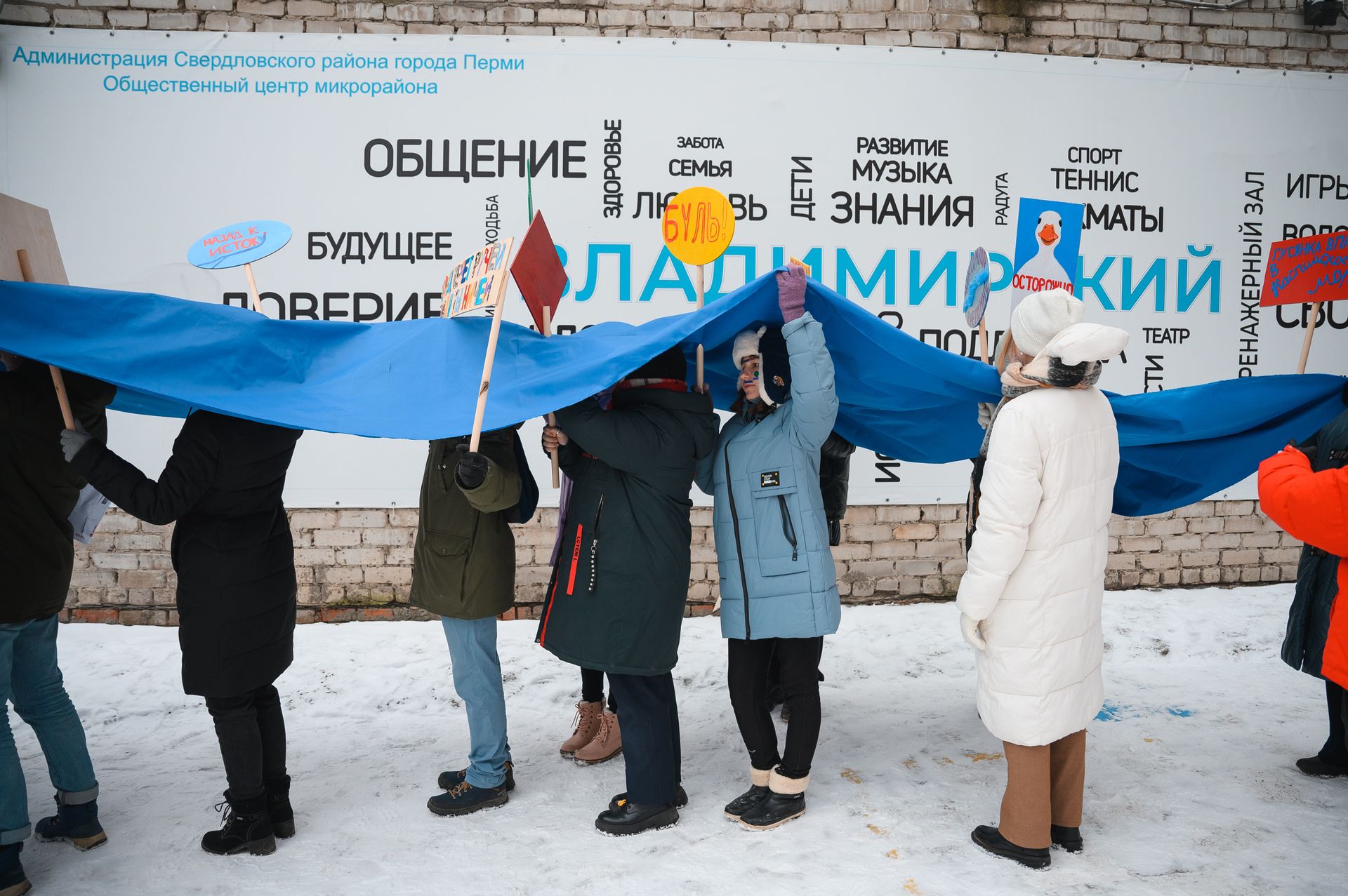 Микрорайон Владимирский — не самое уютное место в Перми. Старые двухэтажные шлакоблочные дома, между ними — пустыри, заросшие сорняками выше человеческого роста, панельные пятиэтажки… Здесь два очага культуры: библиотека им. Михаила Осоргина (когда-то загородный дом Осоргина находился именно в этих местах) и Общественный центр микрорайона. Именно оттуда, из Общественного центра, в воскресенье 27 ноября стартовало костюмированное шествие, которое завершилось просветительским митингом на берегу речки Гусянки.