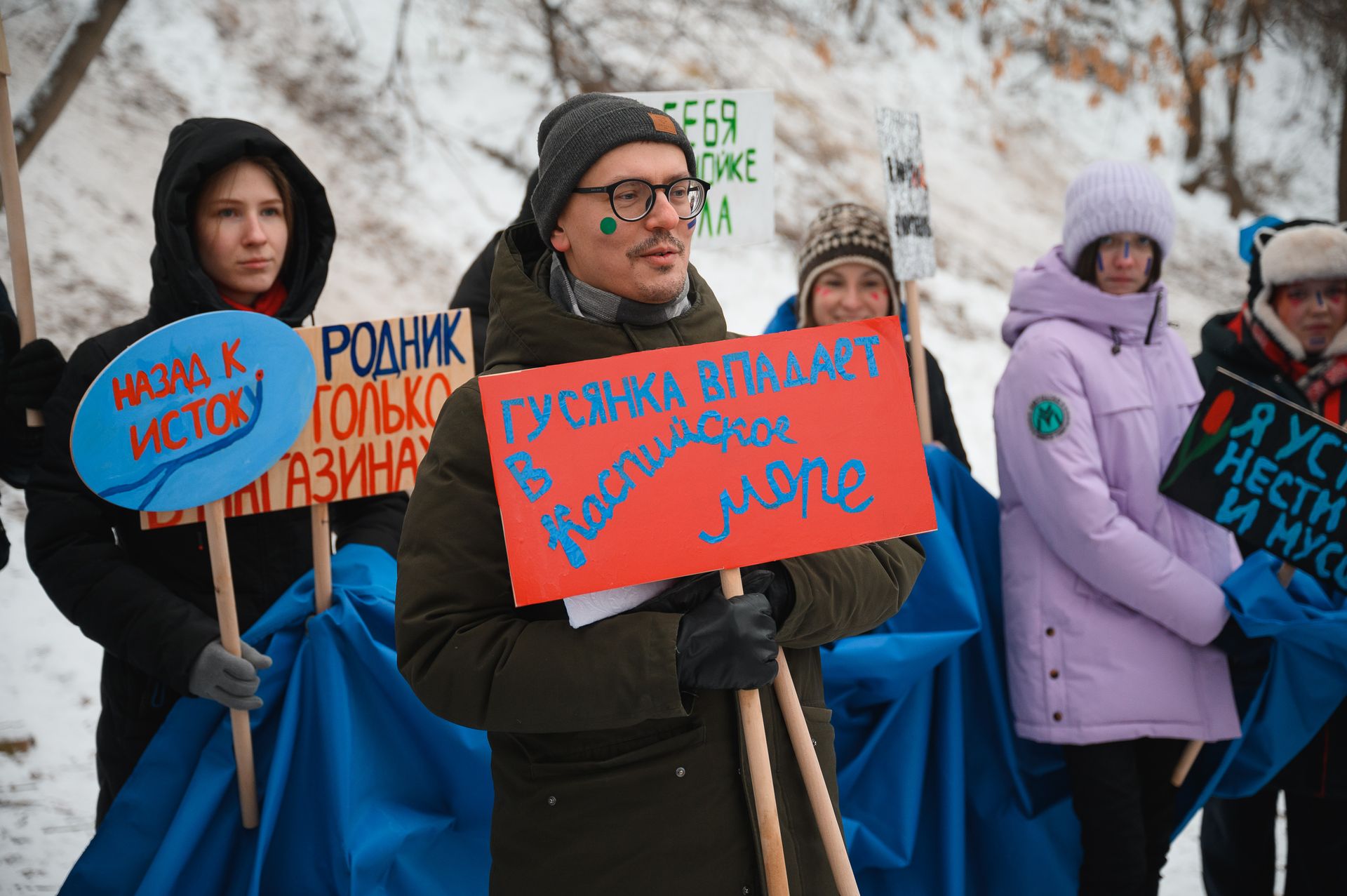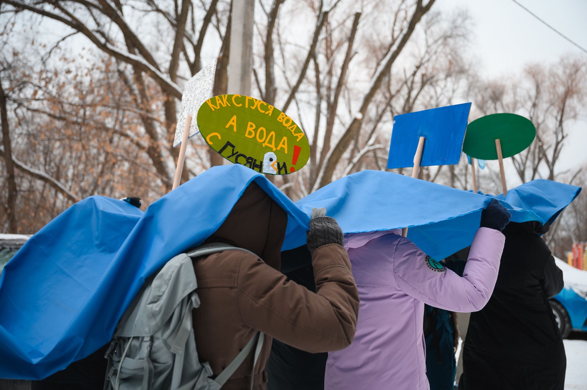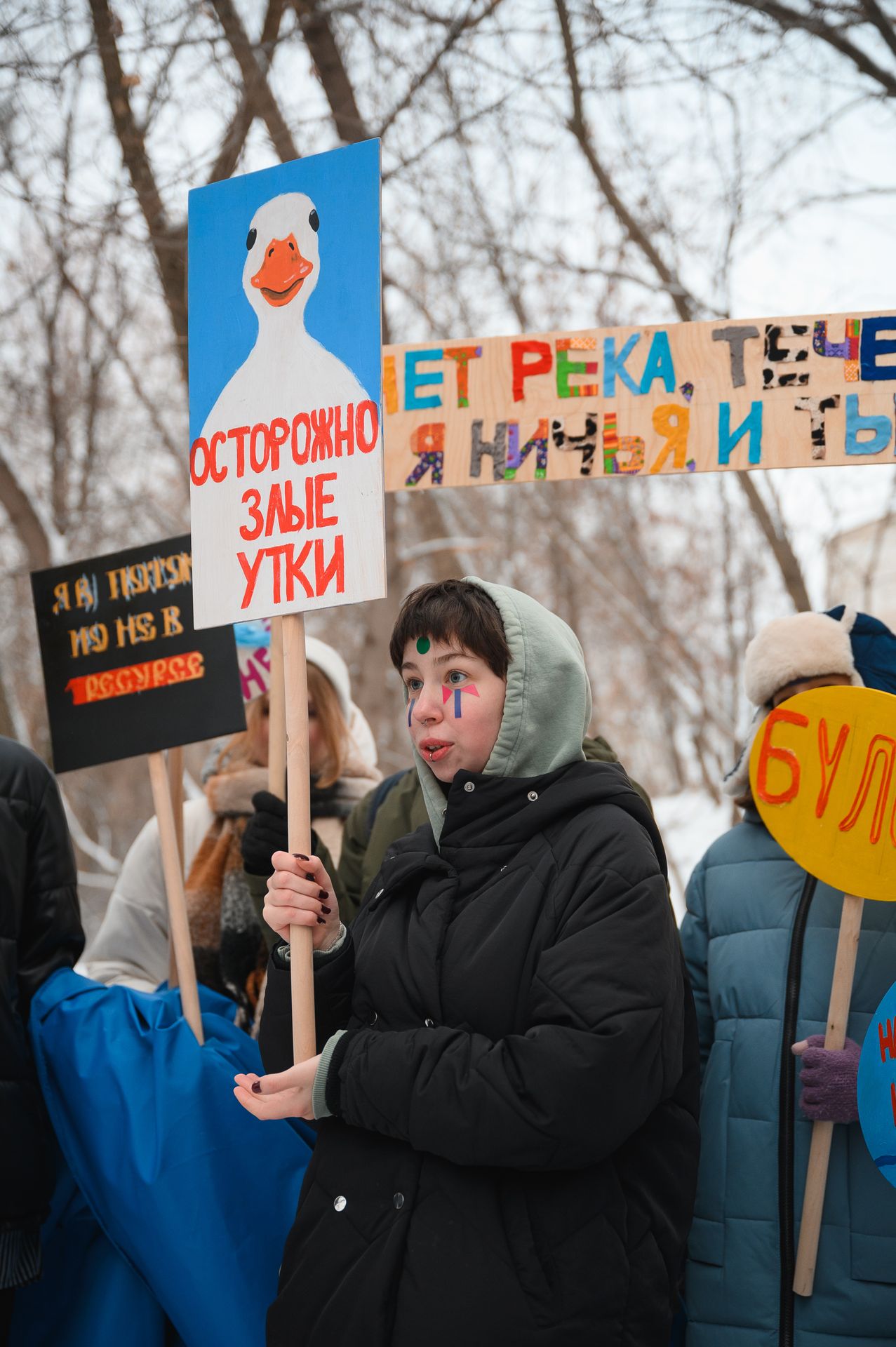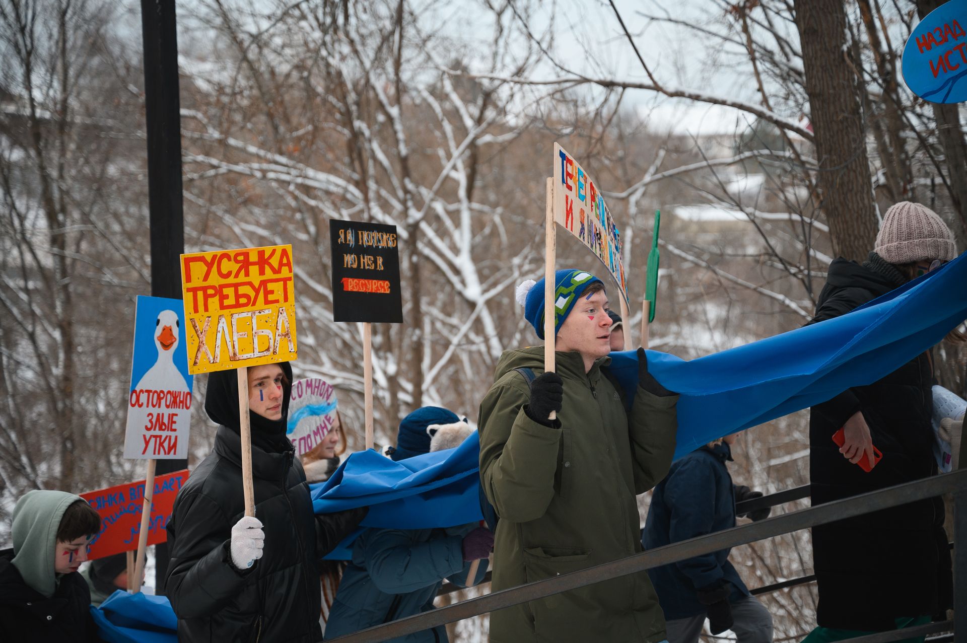 На берегу реки участники шествия выстроились и призвали всех прохожих присоединиться к митингу. «Гусянка впадает в Егошиху, Егошиха — в Каму, Кама — в Волгу, а Волга — в Каспийское море! — вещал Сергей Баландин. — Вроде речка маленькая, а он неё зависит уровень воды в Каспии. И неизвестно ещё, что куда впадает, — бывают географические ошибки. Может, если разобраться, Гусянка здесь самая главная, и именно она впадает в Каспийское море!»