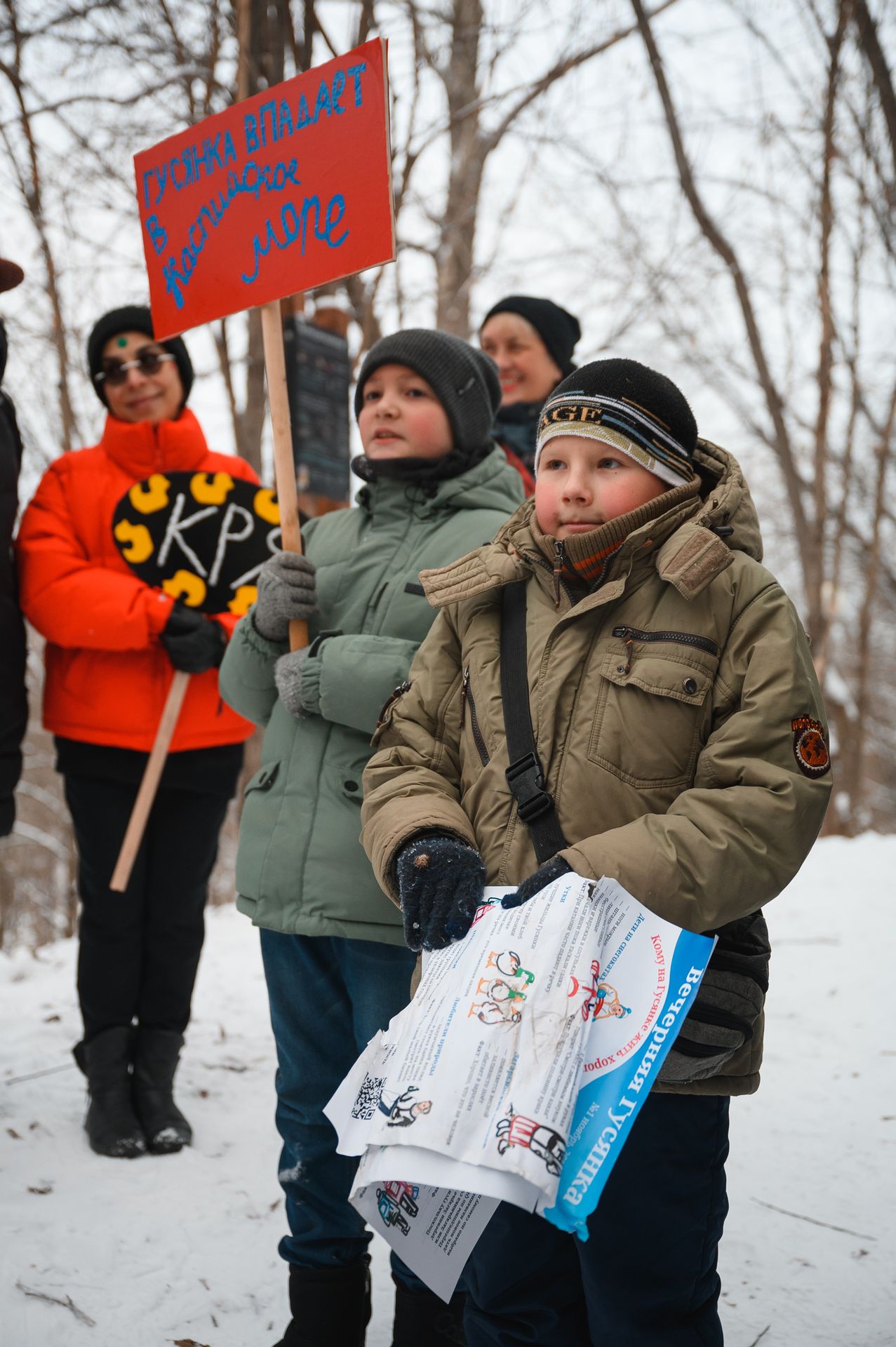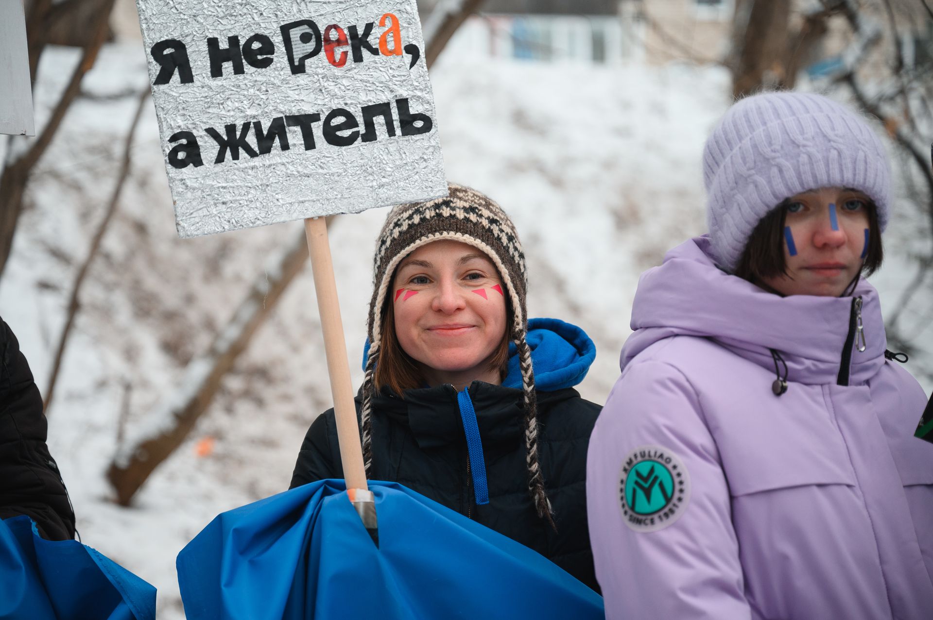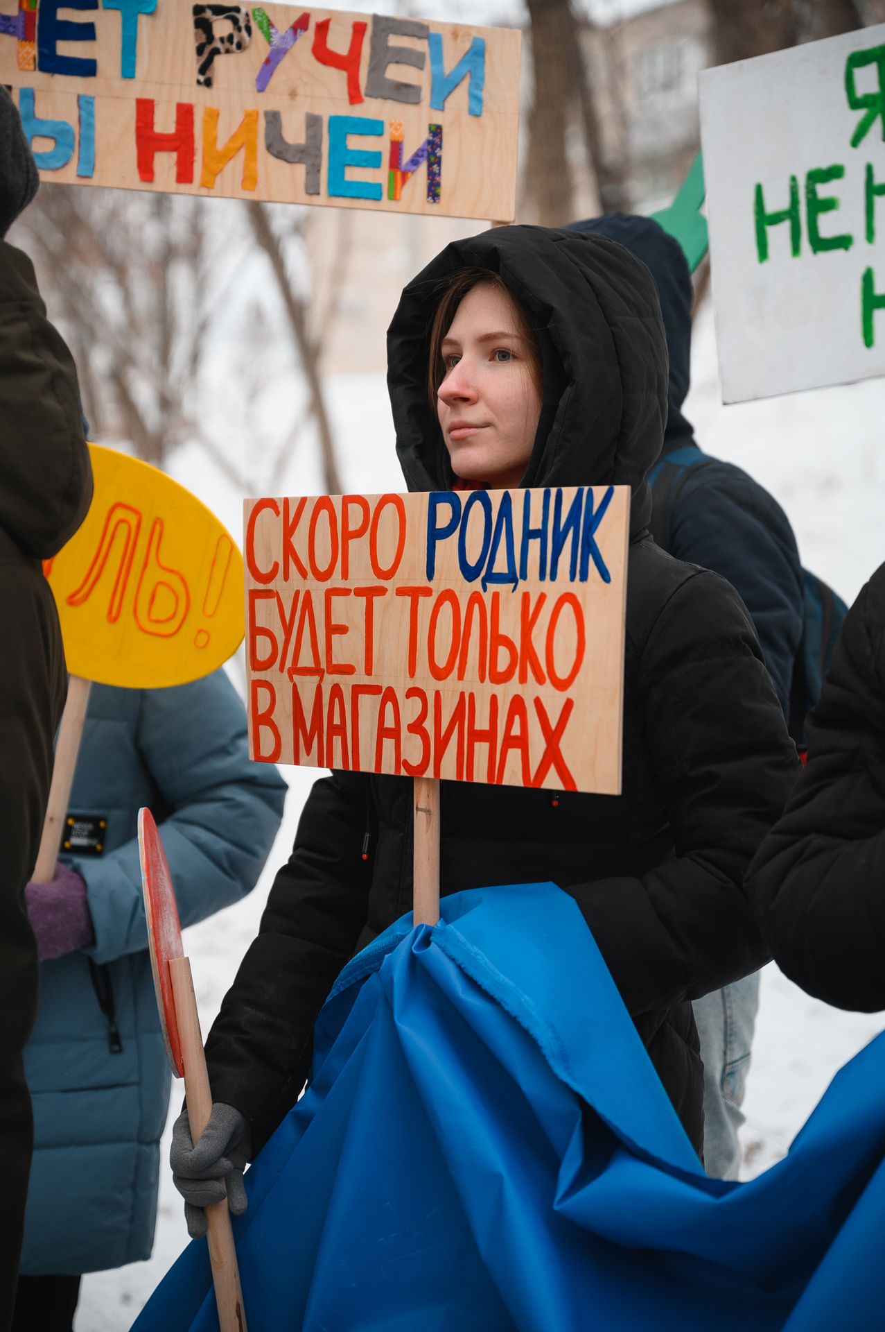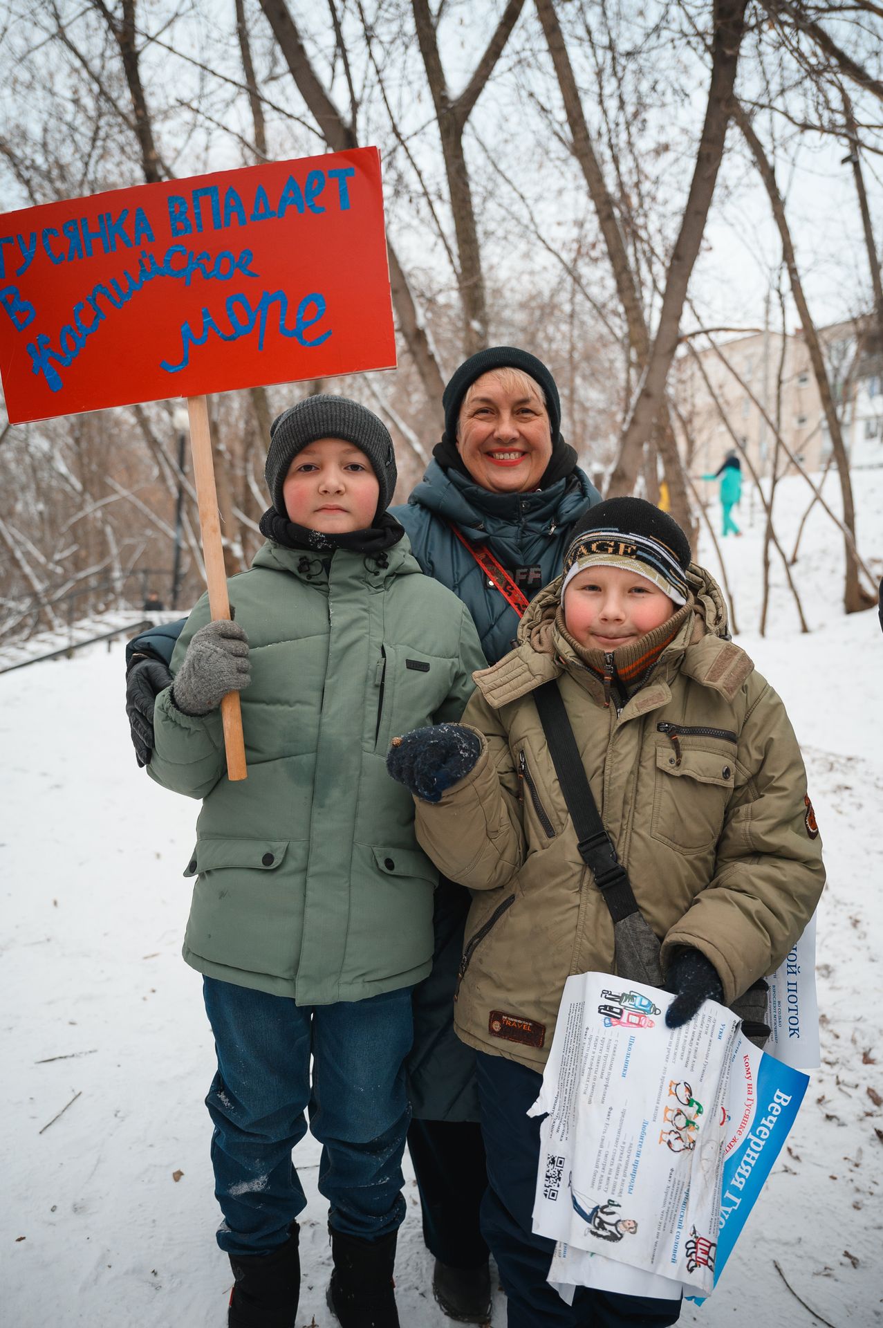 На берегу реки участники шествия выстроились и призвали всех прохожих присоединиться к митингу. «Гусянка впадает в Егошиху, Егошиха — в Каму, Кама — в Волгу, а Волга — в Каспийское море! — вещал Сергей Баландин. — Вроде речка маленькая, а он неё зависит уровень воды в Каспии. И неизвестно ещё, что куда впадает, — бывают географические ошибки. Может, если разобраться, Гусянка здесь самая главная, и именно она впадает в Каспийское море!»