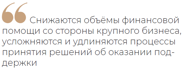 Изменилась и структура поддержки, особенно в корпоративном сегменте. Например, снижаются объёмы финансовой помощи со стороны крупного бизнеса, усложняются и удлиняются процессы принятия решений об оказании поддержки. Эта тенденция проявит себя сильнее в конце этого и начале следующего года, поскольку традиционно это время, когда крупные компании активно делают пожертвования, считают в фонде.