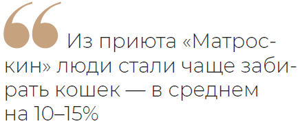 А из приюта «Матроскин» люди стали чаще забирать кошек — в среднем на 10—15%. При этом у фонда стала частично меняться сфера деятельности, потому что у людей появились новые потребности: например, им нужна помощь с вывозом своего питомца за границу, чего раньше не было. Приют помогает пермякам с оформлением справок и консультирует о том, как им выехать вместе с питомцами.