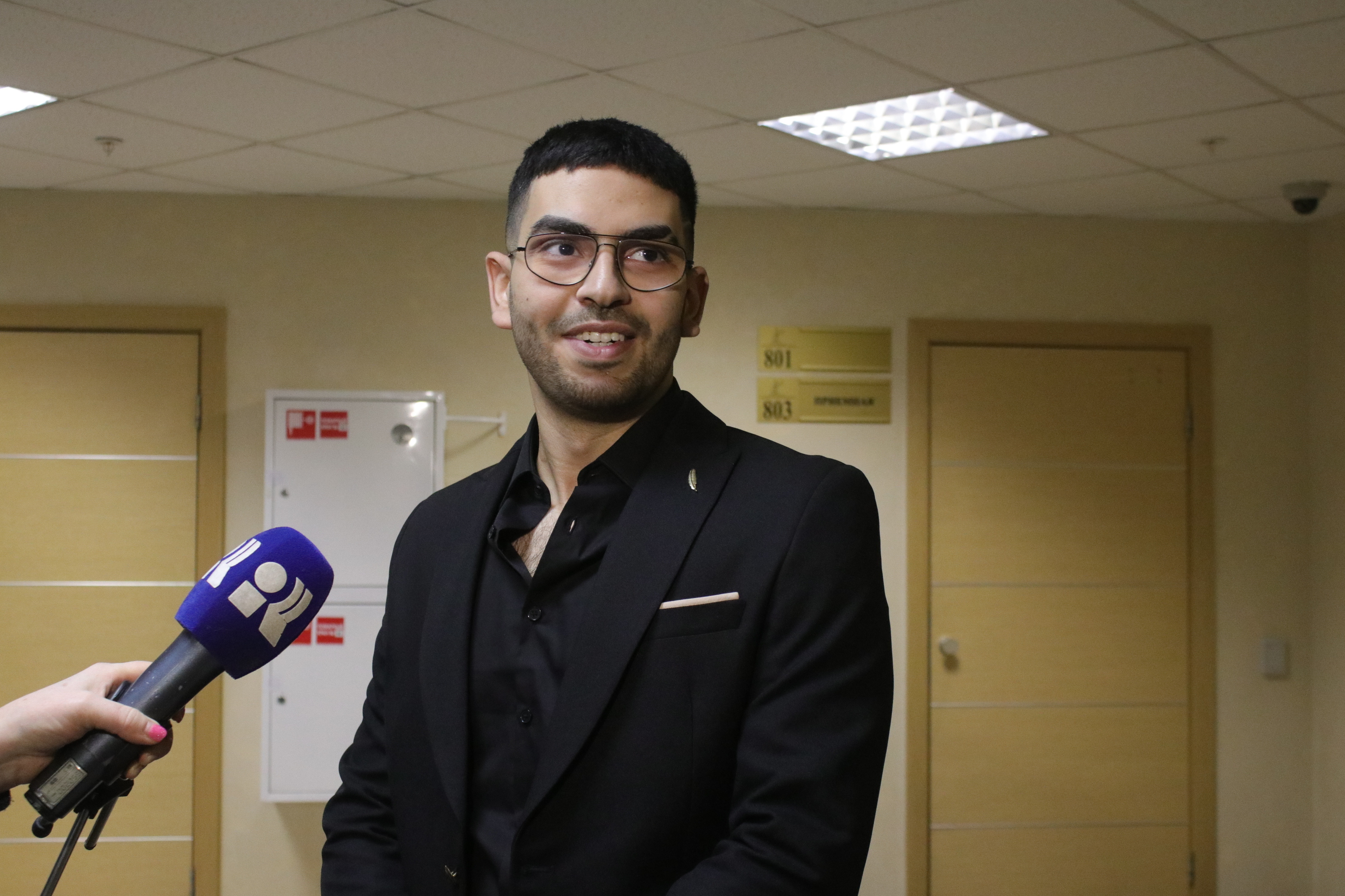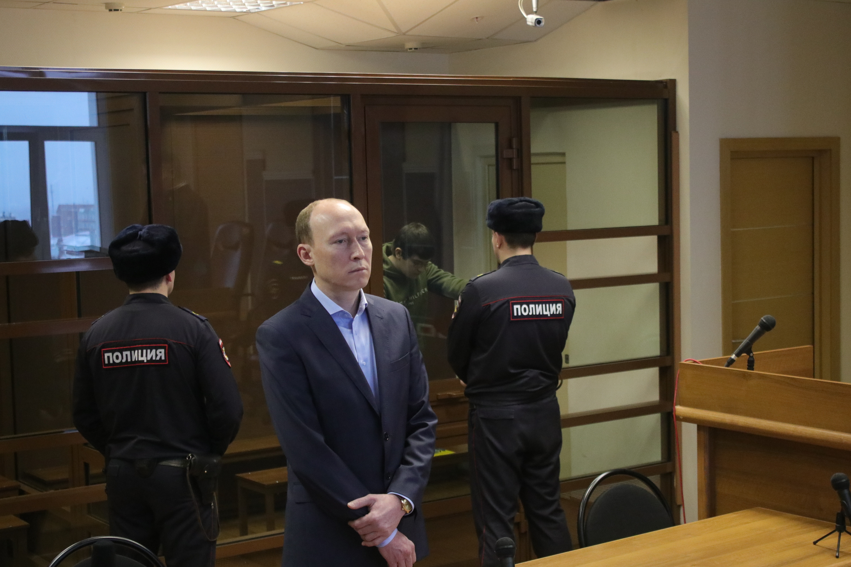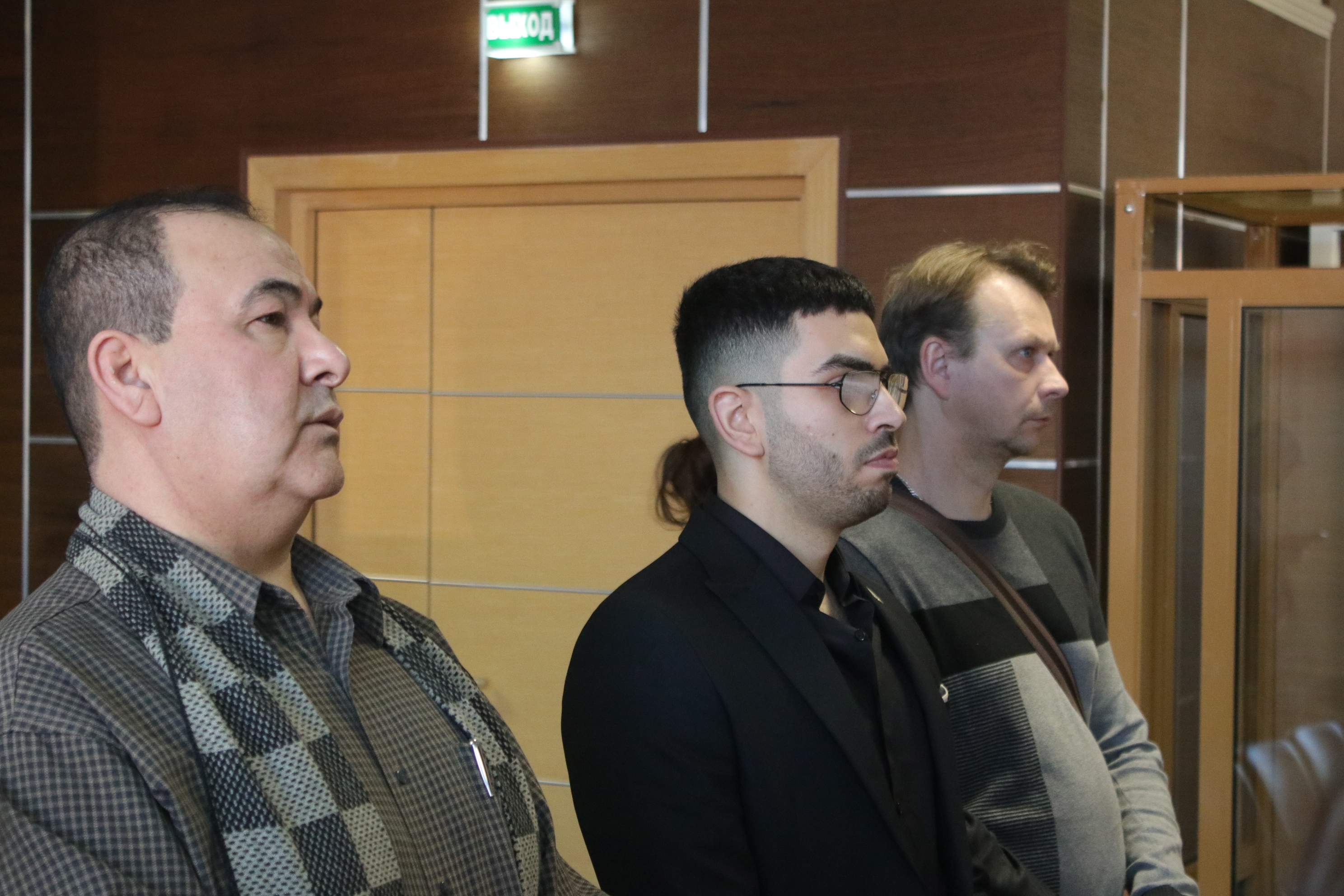 Когда журналистов запустили в зал заседаний, Бекмансуров находился уже в «аквариуме» — его охраняли двое полицейских. Потерпевшим отвели место в первом ряду, журналистов попросили не выходить за ленту, а слушателей — занять места на задних рядах.